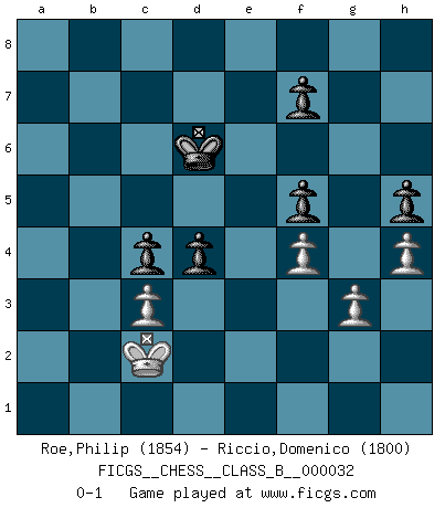 Last move : 0-1 2008 February 24 18:4:21 [Event "FICGS__CHESS__CLASS_B__000032"] [Site "FICGS"] [Date "2007.11.09"] [Round "1"] [White "Roe,Philip"] [Black "Riccio,Domenico"] [Result "0-1"] [WhiteElo "1854"] [BlackElo "1800"] 1.Nc3 e5 2.Nf3 Nc6 3.d4 exd4 4.Nxd4 Nf6 5.Bg5 Bb4 6.Nxc6 Bxc3+ 7.bxc3 bxc6 8.Qd4 d6 9.e3 h6 10.Bxf6 Qxf6 11.Qxf6 gxf6 12.Be2 Be6 13.c4 Rg8 14.g3 Rg5 15.Kd2 Rc5 16.Kc3 Bxc4 17.Bxc4 d5 18.Rhb1 Rxc4+ 19.Kd3 Kd7 20.Rb7 Ra4 21.Kc3 c5 22.Kb3 Ra6 23.Rb5 Rb6 24.a4 c6 25.Rxb6 axb6 26.Rd1 Kc7 27.c3 h5 28.h4 c4+ 29.Kb4 c5+ 30.Ka3 Kc6 31.Rb1 f5 32.Rb2 Ra5 33.Rb1 b5 34.Rxb5 Rxb5 35.axb5+ Kxb5 36.Kb2 Kc6 37.Kc2 Kd6 38.f4 d4 39.exd4 cxd4 0-1 Dunst (Sleipner-Heinrichsen) Opening Player Black won this chess game. Follow this game move after move (download)When you play Bobby, it is not a question if you win or lose. It is a question if you survive. (Boris Spassky) Der Vorposten provoziert a) eine Basis für neue Angriffe und b) eine Schwächung der gegnerischen Widerstandskraft in der fraglichen Linie. (Aaron Nimzowitsch) El Ajedrez es parte de la cultura, y si una cultura esta en decadencia, entonces también el Ajedrez declinará. (Mikhail Botvinnik) Je ne crois pas en la psychologie, je crois aux bons coups. (Robert Fischer) Men never do evil so completely and cheerfully as when they do it from religious conviction. (Blaise Pascal)