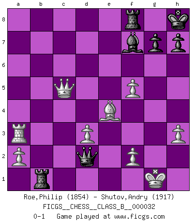 Last move : 0-1 2008 February 24 18:5:41 [Event "FICGS__CHESS__CLASS_B__000032"] [Site "FICGS"] [Date "2007.11.09"] [Round "1"] [White "Roe,Philip"] [Black "Shutov,Andry"] [Result "0-1"] [WhiteElo "1854"] [BlackElo "1917"] 1.e4 Nf6 2.Nc3 d5 3.exd5 Nxd5 4.g3 Nxc3 5.bxc3 e5 6.Bg2 Nc6 7.Nf3 Bc5 8.O-O O-O 9.d3 f6 10.Be3 Qe7 11.Qe2 Bg4 12.Rab1 Rab8 13.Rb5 Bxe3 14.Qxe3 a6 15.Rb2 Qa3 16.Rfb1 Qxc3 17.Nd2 Nd4 18.h3 Bf5 19.g4 Bg6 20.Bxb7 Nxc2 21.Qa7 Kh8 22.Nf1 Nd4 23.Rb3 Nxb3 24.Rxb3 Qc2 25.Qxa6 Bf7 26.Ra3 e4 27.Bxe4 Rb2 28.Qa7 f5 29.gxf5 c5 30.Nd2 Qxd2 31.Qxc5 Rb1+ 0-1 Alekhine's defense : Scandinavian variation Kingside Castling by player White (move 8) Kingside Castling by player Black (move 8) Player Black won this chess game. Follow this game move after move (download)Chess is ruthless: you've got to be prepared to kill people. (Nigel Short) Wer der Ansicht ist, daß alle Schachspieler verrückt sind, wird durch Studium des Lebens von Emil Josef Diemer nicht auf andere Gedanken kommen. (Hans Ree) El Ajedrez tiene tanto misterio como las mujeres. (Purdy) Les échecs sont un jeu terrible. Si vous n'avez pas le centre, votre adversaire a une position plus libre. Par contre, si vous avez le centre, alors vous avez vraiment quelque chose pour laquelle vous inquiéter ! (Siegbert Tarrasch) Drag your thoughts away from your troubles... by the ears, by the heels, or any other way you can manage it. (Mark Twain)
