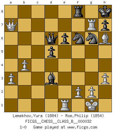 Last move : 1-0 2008 May 15 1:2:52 [Event "FICGS__CHESS__CLASS_B__000032"] [Site "FICGS"] [Date "2007.11.09"] [Round "1"] [White "Lemekhov,Yura"] [Black "Roe,Philip"] [Result "1-0"] [WhiteElo "1884"] [BlackElo "1854"] 1.d4 Nf6 2.c4 Nc6 3.Nf3 e6 4.Nc3 Bb4 5.Qc2 O-O 6.e3 d6 7.Bd2 e5 8.d5 Ne7 9.Bd3 c6 10.dxc6 bxc6 11.h3 Ng6 12.a3 Ba5 13.O-O Re8 14.b4 Bc7 15.Rac1 Bd7 16.Rfd1 Rc8 17.e4 Qe7 18.c5 d5 19.exd5 cxd5 20.Re1 Rcd8 21.Nb5 Bb8 22.c6 e4 23.c7 Rc8 24.cxb8Q Rxb8 25.Nc7 exd3 26.Qxd3 Qd6 27.Nxe8 Bxe8 28.Qd4 Bc6 29.Qxa7 Bb5 30.Rc7 Rf8 31.Nd4 Bd3 32.Ne6 fxe6 33.Rxg7+ Kh8 34.Bh6 1-0 Kevitz-Trajkovich defense Kingside Castling by player Black (move 5) Kingside Castling by player White (move 13) Promotion Queen by player White (move 24) Player White won this chess game. Follow this game move after move (download)Help your pieces so they can help you. (Paul Morphy) Wenn du auf das Glück wartest, wird das Leben ziemlich langweilig. (Mikhail Nekhemyevich Tal) El Ajedrez es un mar en el cual un mosquito puede beber y un elefante puede bañarse. (Refrán Hindú) Le plus grand jeu de l'esprit jamais inventé, plus vous l'apprenez, plus vous y prenez du plaisir. (Garry Kasparov) Games, world of games... There's always an opponent, and there's always a victim. (Revolver, movie)