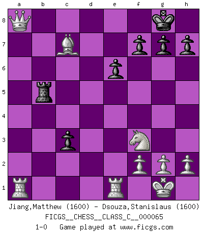 Last move : 1-0 2007 December 13 14:20:50 [Event "FICGS__CHESS__CLASS_C__000065"] [Site "FICGS"] [Date "2007.11.10"] [Round "1"] [White "Jiang,Matthew"] [Black "Dsouza,Stanislaus"] [Result "1-0"] [WhiteElo "1600"] [BlackElo "1600"] 1.e4 Nc6 2.Nf3 d5 3.exd5 Qxd5 4.Nc3 Qd8 5.d4 e6 6.Bb5 Bd7 7.O-O Bb4 8.d5 Bxc3 9.dxc6 Bxc6 10.Bxc6+ bxc6 11.Qxd8+ Rxd8 12.bxc3 Ne7 13.Be3 Nd5 14.Bxa7 Nxc3 15.Rfe1 O-O 16.Bc5 Rfe8 17.a4 Ra8 18.a5 Red8 19.a6 Rd5 20.Be3 c5 21.Bd2 Nb5 22.c4 R5d8 23.cxb5 Rd5 24.Bf4 Rf5 25.Bxc7 c4 26.b6 Rb5 27.b7 Re8 28.a7 c3 29.a8Q Rxa8 30.bxa8Q+ 1-0 KP : Nimzovich defense Kingside Castling by player White (move 7) Kingside Castling by player Black (move 15) Promotion Queen by player White (move 29) Promotion Queen by player White (move 30) Player White won this chess game. Follow this game move after move (download)Chess is imagination. (David Bronstein) Wenn es im Universum noch irgendwo intelligente Lebewesen gibt, dann kennen sie Go. (Emanuel Lasker) El muchacho (en ese entonces un niño de 12 años llamado Anatoly Karpov) no tiene ni idea de lo que es el Ajedrez y no hay futuro en absoluto para el en esta profesión. (Mikhail Botvinnik) On est toujours la mazette de quelqu'un d'autre. (Anonyme) I feel so... helpless. (C-3PO in Star Wars ep.3)