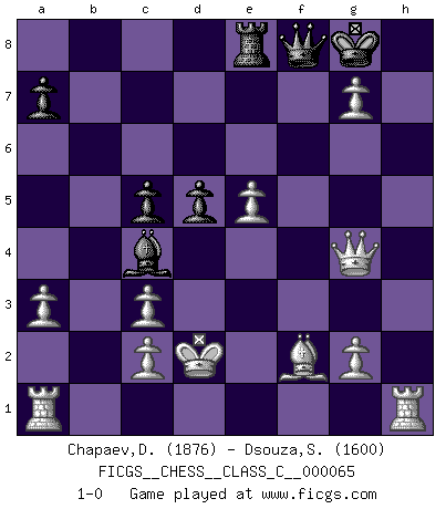 Last move : 1-0 2007 December 21 12:8:12 [Event "FICGS__CHESS__CLASS_C__000065"] [Site "FICGS"] [Date "2007.11.10"] [Round "1"] [White "Chapaev,Dmitry"] [Black "Dsouza,Stanislaus"] [Result "1-0"] [WhiteElo "1876"] [BlackElo "1600"] 1.e4 Nc6 2.d4 d5 3.Nc3 e6 4.Nf3 Bb4 5.e5 Nge7 6.a3 Ba5 7.Bd3 Ng6 8.h4 O-O 9.Ng5 h6 10.Qh5 Nce7 11.Nxf7 Rxf7 12.Bxg6 Nxg6 13.Qxg6 Bxc3+ 14.bxc3 Qf8 15.Bxh6 b6 16.h5 Ba6 17.Be3 c5 18.dxc5 bxc5 19.Qxe6 Bc4 20.h6 Re8 21.Qg4 Rxf2 22.hxg7 Rf1+ 23.Kd2 Rf2+ 24.Bxf2 1-0 KP : Nimzovich defense, Bogolyubov variation Kingside Castling by player Black (move 8) Player White won this chess game. Follow this game move after move (download)I played Chess with him and would have beaten him sometimes only he always took back his last move, and ran the game out differently. (Mark Twain) Gewöhnliche Menschen denken nur daran, wie sie ihre Zeit verbringen. Ein intelligenter Mensch versucht, sie auszunutzen. (Arthur Schopenhauer) En el Ajedrez, tal como es jugado por los Maestros, practicamente la suerte es eliminada. (Emanuel Lasker) Le thème de l'attaque double intervient d'une manière ou d'une autre dans l'immense majorité des combinaisons. (Youri Averbakh) A good aphorism is too hard for the tooth of time, and is not worn away with the centuries, although it serves as food for every speech. (Friedrich Nietzsche)