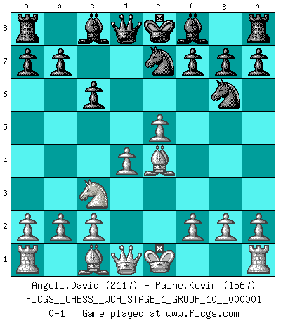 Last move : 0-1 2006 August 14 5:36:31 [Event "FICGS__CHESS__WCH_STAGE_1_GROUP_10__000001"] [Site "FICGS"] [Date "2006.07.01"] [Round "1"] [White "Angeli,David"] [Black "Paine,Kevin"] [Result "0-1"] [WhiteElo "2117"] [BlackElo "1567"] 1.e4 e5 2.Nf3 Nc6 3.Nc3 Nf6 4.Nxe5 Nxe5 5.d4 Ng6 6.e5 Ng8 7.Bc4 d5 8.Bxd5 c6 9.Be4 N8e7 0-1 This chess game has been lost on time (started : 2006.07.01 16:12:39) Four knights : Schultze-Mueller gambit Player Black won this chess game. Follow this game move after move (download)We don't really know how the game was invented, though there are suspicions. As soon as we discover the culprits, we'll let you know. (Bruce Pandolfini) Ich brauche nur einen Blick auf das Schachbrett zu werfen, und weiß schon, was in der Stellung steckt, was geschehen kann und was geschehen wird. Alle übrigen suchen und prüfen, ich aber weiß es! (José Raúl Capablanca) Mis oponentes también hacen buenas movidas. A veces yo no tomo esas cosas en consideración. (Bobby Fischer) Il vaut toujours mieux jouer un plan faux de façon logique que de n'avoir pas de plan du tout. (Victor Kortchnoï) When you stop learning you start dying. (M. Scott Adams)