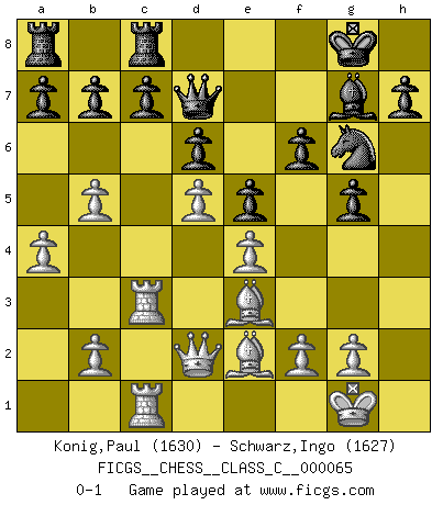 Last move : 0-1 2008 June 2 23:25:11 [Event "FICGS__CHESS__CLASS_C__000065"] [Site "FICGS"] [Date "2007.11.10"] [Round "1"] [White "Konig,Paul"] [Black "Schwarz,Ingo"] [Result "0-1"] [WhiteElo "1630"] [BlackElo "1627"] 1.c4 g6 2.Nf3 Bg7 3.e4 f6 4.d4 Nh6 5.Bd3 Nf7 6.Nc3 Nc6 7.O-O O-O 8.Be3 d6 9.Qd2 Bd7 10.h4 e5 11.d5 Ne7 12.h5 g5 13.a4 Nh6 14.Nh2 Qe8 15.Nb5 Bxb5 16.cxb5 Qxh5 17.Rac1 Rfc8 18.Rc3 Ng4 19.Nxg4 Qxg4 20.Rfc1 Ng6 21.Be2 Qd7 0-1 This chess game has been lost on time (started : 2007.11.10 8:11:36) English Opening Kingside Castling by player White (move 7) Kingside Castling by player Black (move 7) Player Black won this chess game. Follow this game move after move (download)No one ever won a game by resigning. (Unknown) Wenn man heute mit 14 Jahren noch kein GM ist, kann man es vergessen. (Viswanathan Anand) A través de las casillas del tablero, los Indios explican el movimiento del tiempo y la edad, las influencias mas altas que controlan el mundo y los lazos que vinculan al Ajedrez con el alma humana. (Al-Masudi) Les sacrifices démontrent seulement que quelqu'un a gaffé. (Savielly Tartacover) Perception is reality. (Immanuel Kant)