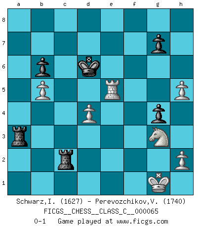 Last move : 0-1 2008 June 9 5:22:1 [Event "FICGS__CHESS__CLASS_C__000065"] [Site "FICGS"] [Date "2007.11.10"] [Round "1"] [White "Schwarz,Ingo"] [Black "Perevozchikov,Vjacheslav"] [Result "0-1"] [WhiteElo "1627"] [BlackElo "1740"] 1.g3 d5 2.Bg2 e5 3.f3 Nc6 4.Nh3 Bc5 5.Nf2 Nf6 6.Nc3 Qe7 7.d3 Be6 8.O-O O-O-O 9.a3 h5 10.Bg5 h4 11.gxh4 Qd7 12.b4 Be7 13.Qd2 Nh5 14.b5 Nd4 15.Bxe7 Qxe7 16.Ng4 Nf4 17.e3 Bxg4 18.h5 Nxg2 19.fxg4 Nxe3 20.Qxe3 f5 21.Ne2 Nxc2 22.Qxa7 Nxa1 23.Rxa1 Qd6 24.Rc1 Kd7 25.Qxb7 Qb6+ 26.Qxb6 cxb6 27.d4 Rc8 28.Rf1 Rc2 29.Ng3 fxg4 30.Rf5 Ra8 31.Rxe5 Rxa3 32.Rxd5+ Ke6 33.Re5+ Kd6 0-1 Benko's Opening Kingside Castling by player White (move 8) Queenside Castling by player Black (move 8) Player Black won this chess game. Follow this game move after move (download)Your body has to be in top condition. Your Chess deteriorates as your body does. You can't separate body from mind. (Bobby Fischer) Ich verachte die Medien. (Robert James Fischer) Los libros de Ajedrez deben de usarse igual como usamos los anteojos: para mejorar la vista, aunque algunos jugadores los quieren usar como si ellos les otorgaran la vision. (José Raúl Capablanca) Vous savez, camarade Pachman, je n'éprouve pas de plaisir à être ministre, je jouerais plutôt aux échecs comme vous, ou alors ferais une révolution au Venezuela. (Che Guevara à Ludek Pachman, 'Checkmate in Prague', 1975) I think your argument is specious - I think your tie is ugly. (Gregory House to Dr. Foreman, House M.D.)