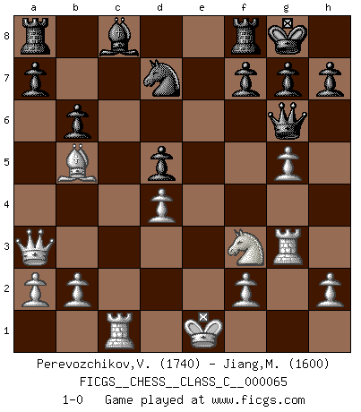 Last move : 1-0 2008 March 10 3:53:29 [Event "FICGS__CHESS__CLASS_C__000065"] [Site "FICGS"] [Date "2007.11.10"] [Round "1"] [White "Perevozchikov,Vjacheslav"] [Black "Jiang,Matthew"] [Result "1-0"] [WhiteElo "1740"] [BlackElo "1600"] 1.d4 d5 2.Nf3 Nf6 3.c4 c6 4.e3 e6 5.Nc3 Nbd7 6.Qc2 Bd6 7.g4 Bb4 8.Bd2 Qe7 9.Rg1 b6 10.cxd5 Nxd5 11.Nxd5 cxd5 12.Rc1 O-O 13.Bxb4 Qxb4+ 14.Qc3 Qe7 15.Qa3 Qf6 16.Rg3 e5 17.g5 Qg6 18.Bb5 exd4 19.exd4 1-0 This chess game has been lost on time (started : 2007.11.10 8:11:36) Queen's pawn game Kingside Castling by player Black (move 12) Player White won this chess game. Follow this game move after move (download)Chess teaches you to control the initial excitement you feel when you see something that looks good and it trains you to think objectively when you're in trouble. (Stanley Kubrick) Um sich vor der Gefahr einer Erkältung zu schützen, sorge der wanderlustige König beizeiten für ein brauchbares Versteck. (Aaron Nimzowitsch) El Ajedrez no es una pizca de inferior al violín, y tenemos un gran número de violinistas profesionales. (Mikhail Botvinnik) J'ai vu le vaincu d'Echecs jouer des années durant dans l'espoir de la fête de la victoire. Car tu es plus riche de ce qu'elle existe si même elle n'est point pour toi. Ainsi de la perle du fond des mers. (Antoine de Saint-Exupéry) Mac users swear by their computers. PC users swear at their computers. (Author unknown)