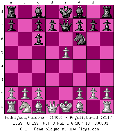 Last move : 0-1 2006 July 17 19:32:56 [Event "FICGS__CHESS__WCH_STAGE_1_GROUP_10__000001"] [Site "FICGS"] [Date "2006.07.01"] [Round "1"] [White "Rodrigues,Valdemar"] [Black "Angeli,David"] [Result "0-1"] [WhiteElo "1400"] [BlackElo "2117"] 1.e4 e5 2.Nf3 Nc6 3.d4 exd4 4.Nxd4 Nf6 5.Nxc6 bxc6 6.e5 Qe7 0-1 Scotch : Mieses variation Player Black won this chess game. Follow this game move after move (download)Morphy was probably the greatest genius of them all. (Bobby Fischer) Wenn sie aufgeben, dann danke ich Ihnen für das Spiel (Eventualzug beim Fernschach). (Anonymous) El Ajedrez no es como la vida... ¡tiene reglas!. (Mark Pasternak) Les échecs sont plus proches de l'art de l'assassinat que de l'art de la guerre. (Arturo Perez-Reverte) In fact if nothing is done against this teddy bear, hereby I announce that I would quit chess, rapid chess, blitz chess, postal chess, email chess, server chess and correspondence chess I will then switch to a table game where teddy bears aren't going to be seen for a while, like Poker, or Roulette, all 18+ games. (Elmer Valderrama)