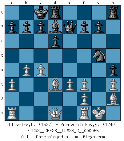 Last move : 0-1 2008 January 28 21:16:40 [Event "FICGS__CHESS__CLASS_C__000065"] [Site "FICGS"] [Date "2007.11.10"] [Round "1"] [White "Oliveira,Carlos"] [Black "Perevozchikov,Vjacheslav"] [Result "0-1"] [WhiteElo "1637"] [BlackElo "1740"] 1.d4 Nf6 2.c4 e5 3.dxe5 Ng4 4.Bf4 Nc6 5.Nf3 Bb4+ 6.Nbd2 Qe7 7.a3 Ngxe5 8.e3 Nxf3+ 9.gxf3 Bxd2+ 10.Qxd2 d6 11.Bd3 Nd4 12.Qd1 Bd7 13.O-O Ne6 14.Bg3 h5 15.h3 O-O-O 16.b4 h4 17.Bh2 Ng5 0-1 Budapest : Rubinstein variation Kingside Castling by player White (move 13) Queenside Castling by player Black (move 15) Player Black won this chess game. Follow this game move after move (download)You can only get good at Chess if you love the game. (Bobby Fischer) Computer sind die einzigen Gegner, die nicht immer eine Ausrede auf Lager haben, wenn sie gegen mich verlieren. (Robert James Fischer) No todos los artistas son jugadores de Ajedrez, pero todos los jugadores de Ajedrez son artistas. (Marcel Duchamp) Echiquier : carré parfait, comme la Jérusalem nouvelle décrite par l'auteur de l'Apocalypse, huit cases sur huit, exaltation du chiffre 4, symbole du cosmos aux quatre horizons... où le noir et le blanc, l'ombre et la lumière, le mal et le bien s'entremêlent et se conjuguent. (Robert Couffignal, Le Gambit du poète) . 'gn is not allowed in chess unless n is an integer between 1 and 8 inclusive, where 1 and 8 are to interpreted as the standard numerals standing for integers in the ordered real-closed field R, with the *canonical* ordering. (As opposed to, say, an integer in the domain Z[2+i*sqrt(5)] or an integer in some exotic Grothendieck topos). (Normajean Yates)