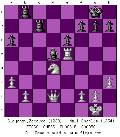Last move : 1-0 2008 January 11 17:47:13 [Event "FICGS__CHESS__CLASS_F__000050"] [Site "FICGS"] [Date "2007.11.10"] [Round "1"] [White "Stoyanov,Zdravko"] [Black "Neil,Charlie"] [Result "1-0"] [WhiteElo "1233"] [BlackElo "1354"] 1.e4 e6 2.Nf3 c5 3.h3 Nc6 4.a3 d5 5.e5 Nge7 6.Bb5 a6 7.Bxc6+ bxc6 8.c3 Qc7 9.O-O Ng6 10.d4 Be7 11.Bg5 cxd4 12.cxd4 Qd8 13.Bxe7 Qxe7 14.Qc2 Bb7 15.Qb3 O-O 16.Nc3 Rab8 17.Qc2 c5 18.Rfe1 cxd4 19.Nxd4 Rfc8 20.Qd2 Qc7 21.Rac1 Nxe5 22.Nxd5 Bxd5 23.Rxc7 Rxc7 24.Rxe5 1-0 French defense Kingside Castling by player White (move 9) Kingside Castling by player Black (move 15) Player White won this chess game. Follow this game move after move (download)The blunders are all there on the board, waiting to be made. (Savielly Tartakover) Kombinieren und Schwarzhandel gehören verboten. (Savielly Grigorievitsch Tartakower) La estratégia requiere pensar, la táctica requiere observación. (Max Euwe) La tactique est l'élément le plus important du milieu de jeu. (Siegbert Tarrasch) No, I am still playing. (Anatoly Karpov)
