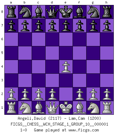 Last move : 1-0 2006 September 4 1:17:29 [Event "FICGS__CHESS__WCH_STAGE_1_GROUP_10__000001"] [Site "FICGS"] [Date "2006.07.01"] [Round "1"] [White "Angeli,David"] [Black "Lam,Cam"] [Result "1-0"] [WhiteElo "2117"] [BlackElo "1200"] 1.e4 1-0 This chess game has been lost on time (started : 2006.07.01 16:12:39) King's pawn Opening Player White won this chess game. Follow this game move after move (download)Pawns are born free, yet they are everywhere in chains. (Rick Kennedy) Kann Schach nicht schließlich das Nationalspiel der Deutschen werden? Und welche weiteren Ausblicke bieten sich dann dar! Welche Hebung des allgemeinen Kultur-Niveaus, ja der Moral, wenn das Schachbrett den Kartentisch verdrängen würde! Wahrlich, ein Ziel, des Schweißes der Edlen wert! (Siegbert Tarrasch) Los Peones son nacidos libres, y aún así, se encuentran encadenados por todos lados. (Rick Kennedy) A chaque perte on perd un peu de soi. (Joël Lautier) Optimism is a variety of information deficit. Sometimes especially true for correspondence chess games. (Michael Aigner)