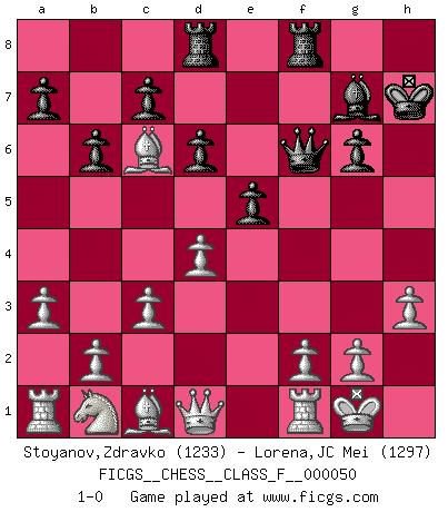 Last move : 1-0 2008 February 8 12:51:40 [Event "FICGS__CHESS__CLASS_F__000050"] [Site "FICGS"] [Date "2007.11.10"] [Round "1"] [White "Stoyanov,Zdravko"] [Black "Lorena,JC Mei"] [Result "1-0"] [WhiteElo "1233"] [BlackElo "1297"] 1.e4 g6 2.Nf3 d6 3.h3 Bg7 4.a3 f5 5.c3 Nf6 6.Be2 Nc6 7.exf5 O-O 8.fxg6 hxg6 9.d4 b6 10.Ng5 Nd5 11.Bf3 e6 12.Bg4 e5 13.Ne6 Bxe6 14.Bxe6+ Kh7 15.Bxd5 Qf6 16.O-O Rad8 17.Bxc6 1-0 This chess game has been lost on time (started : 2007.11.10 14:56:47) Robatsch (Modern) defense Kingside Castling by player Black (move 7) Kingside Castling by player White (move 16) Player White won this chess game. Follow this game move after move (download)A passed Pawn increases in strength as the number of pieces on the board diminishes. (Capablanca) Jeder Schachmeister war einmal ein Anfänger. (Irving Chernev) La señal de un Gran Maestro es su habilidad de ganar una partida rápidamente y sin dolor. (Irving Chernev) L'action d'une oeuvre littéraire se déroule sur un champ de bataille. Les masques et les types du drame moderne correspondent aux pièces du jeu d'échecs. L'intrigue correspond aux coups et aux gambits, c'est à dire aux techniques du jeu telles qu'utilisées et interprétées par les joueurs. Les tactiques et les péripéties [mouvements] correspondent aux coups exécutés par l'adversaire. (Viktor Shklovsky) Unless in communicating with it one says exactly what one means, trouble is bound to result. (Alan Turing, about computers)