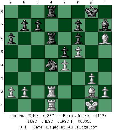 Last move : 0-1 2008 February 8 12:51:40 [Event "FICGS__CHESS__CLASS_F__000050"] [Site "FICGS"] [Date "2007.11.10"] [Round "1"] [White "Lorena,JC Mei"] [Black "Frame,Jeremy"] [Result "0-1"] [WhiteElo "1297"] [BlackElo "1117"] 1.Nf3 Nf6 2.d3 d5 3.g3 Bf5 4.Bg2 e6 5.O-O h6 6.Nc3 Bd6 7.Nd4 Bg6 8.e4 dxe4 9.dxe4 e5 10.Ndb5 O-O 11.Be3 Nc6 12.Nd5 a6 13.Nxf6+ gxf6 14.Nxd6 Qxd6 15.Bxh6 Qxd1 16.Raxd1 Rfd8 17.f4 Rd6 18.f5 Bh7 19.Rd2 Rad8 20.Rfd1 Nd4 21.Be3 Nxc2 22.Bh6 Nd4 0-1 Reti Opening Kingside Castling by player White (move 5) Kingside Castling by player Black (move 10) Player Black won this chess game. Follow this game move after move (download)You know, comrade Pachman, I don't enjoy being a Minister, I would rather play Chess like you. (Che Guevara) Warum muß ich gegen diesen IDIOTEN verlieren? (Aaron Nimzowitsch) EL Ajedrez es como la vida. (Boris Spassky) Même si vous avez un bon coup à faire, regardez toujours s'il n'y en a pas un qui lui soit préférable. (Pedro Damiano) 'preceded by its own quotation yields a falsehood' preceded by its own quotation yields a falsehood. (W. V. O. Quine - Set Theory And Its Logic, 1953)