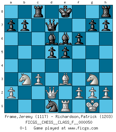 Last move : 0-1 2007 November 25 5:52:1 [Event "FICGS__CHESS__CLASS_F__000050"] [Site "FICGS"] [Date "2007.11.10"] [Round "1"] [White "Frame,Jeremy"] [Black "Richardson,Patrick"] [Result "0-1"] [WhiteElo "1117"] [BlackElo "1203"] 1.e4 Nf6 2.e5 Nd5 3.Bc4 Nb6 4.Bb3 c5 5.c3 c4 6.Bc2 Nc6 7.Ne2 Nxe5 8.d3 cxd3 9.Bxd3 Nxd3+ 10.Qxd3 d5 11.Bf4 f6 12.O-O e5 13.Be3 Be6 14.Nd2 Qd7 15.Nb3 Nc4 16.Ng3 Nxb2 17.Qc2 Nc4 18.Rad1 Rc8 19.Rfe1 Bd6 20.Qd3 Nb2 21.Qd2 Nxd1 0-1 Alekhine's defense Kingside Castling by player White (move 12) Player Black won this chess game. Follow this game move after move (download)Chess is mental torture. (Garry Kasparov) Wir können eben der zündenden Macht des Opfers nicht wiederstehen, denn die Begeisterung für das Opfer liegt in der Natur des Menschen. (Rudolf Spielmann) Evita las multitudes. Haz independientemente tu propio razonamiento. Trata de ser el jugador de Ajedrez, no la pieza de Ajedrez. (Ralph Charell) Demandez au pauvre Cg1 ce qu'il en pense. Eduard Gufeld à propos de la variante Saemisch de l'Est-Indienne. Your best chance to get a Royal Flush in a casino is in the bathroom. (Anonymous)