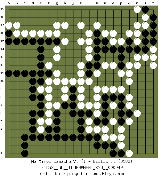 Last move : 0-1 2008 February 24 3:7:9 [Event "FICGS__GO__TOURNAMENT_KYU__000049"] [Site "FICGS"] [Date "2007.11.11"] [Round "1"] [Black "Martinez Camacho,Victor Hugo"] [White "Willis,Jonathan"] [Result "0-1"] [Rating 2 "0100"] 1.c3 p3 2.d6 q16 3.k3 k17 4.g3 q10 5.d10 c16 6.c11 k9 7.e14 g13 8.e12 g10 9.g15 h15 10.f15 g16 11.e15 e9 12.d9 e11 13.e10 f10 14.d11 f12 15.f11 g11 16.e11 g14 17.e13 d16 18.d15 e16 19.c15 f16 20.d8 f7 21.e8 f9 22.e7 q5 23.k6 k7 24.l6 m6 25.k5 l5 26.k4 g17 27.m5 l4 28.l3 m4 29.n5 n4 30.n6 m7 31.n7 l7 32.n8 n9 33.o8 q8 34.m3 n3 35.n2 o3 36.j7 k8 37.j8 m9 38.j9 l10 39.j3 o9 40.j6 p9 41.m2 p4 42.p8 q7 43.p7 m8 44.p5 o5 45.q6 r6 46.p6 o7 47.h3 e5 48.e6 f6 49.d4 e4 50.d5 f5 51.e3 h8 52.f3 j10 53.q15 p15 54.q14 r15 55.p14 o15 56.o14 f8 57.h7 g7 58.r14 s13 59.s14 r13 60.p13 q11 61.n15 o16 62.n14 n16 63.m15 h10 64.d3 h9 65.c2 k15 66.m16 m17 67.s15 r16 68.s16 r17 69.b15 s17 70.t16 l16 71.a15 h17 72.o2 p2 73.p1 q1 74.o1 q12 75.f4 b16 76.m13 l14 77.m14 l13 78.t13 t12 79.b11 n12 80.a16 b17 81.a11 o12 82.m12 m11 83.l12 k12 84.l11 k11 85.p12 p11 86.c1 t14 87.t17 s18 88.t15 t13 89.t18 r12 90.s19 r19 91.g6 l15 92.g5 k10 93.g4 a17 0-1 Here are the names of the openings (joseki) played in the four corners : Corner d16 : c16 c11 Komoku (Somok, Xiao~mu`) 3-4 Point. The komoku (3-4) point is the traditional corner enclosure move.. Corner q16 : q16 q15 Hoshi (Hwajeom, Seongjeom, Xingwei`) 4-4 Point. The star or hoshi (4-4) point, emphasizing influence at the potential expense of territory. Player White won this Go (weiqi, baduk) game. Follow this game move after move (download)Go is essentially a form of harmony. Go in the 21st century will have to be go of the 'harmony of the six points - the four quarters, the above and the below.' As in life we will need to view the whole rather than the part. Japanese go has focused too heavily on the local (joseki) rather than the whole for 300 years. The reason the Chinese and Koreans are overtaking the Japanese is that they are closer to achieve this whole-board view. (Go Seigen, 9p, 1994) At work, the authority of a person is inversely proportional to the number of pens that person is carrying. (Dan Rotaru)