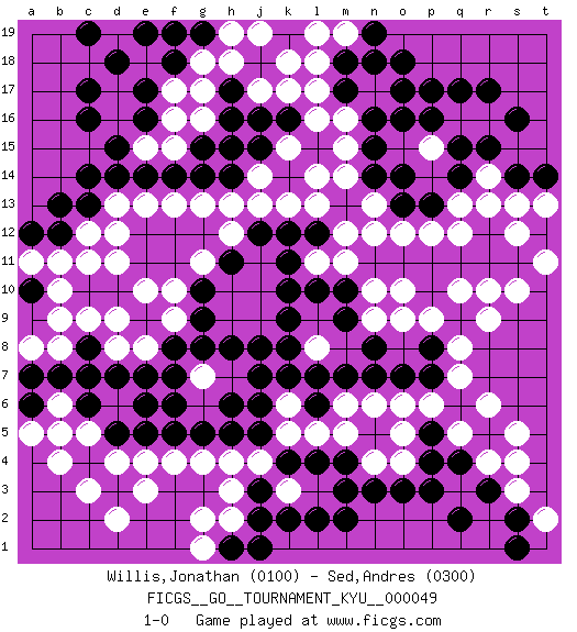 Last move : 1-0 2008 July 16 22:44:12 [Event "FICGS__GO__TOURNAMENT_KYU__000049"] [Site "FICGS"] [Date "2007.11.11"] [Round "1"] [Black "Willis,Jonathan"] [White "Sed,Andres"] [Result "1-0"] [Rating 1 "0100"] [Rating 2 "0300"] 1.d3 q16 2.c17 q10 3.d10 r4 4.k4 j17 5.j12 m6 6.k10 h7 7.k7 k6 8.j8 j7 9.h8 k8 10.l7 l8 11.m7 m8 12.l6 l5 13.n7 n6 14.n8 n9 15.o7 o6 16.p7 p6 17.j6 k5 18.h6 g7 19.g8 g6 20.j5 j4 21.h5 h4 22.g5 g4 23.f5 f4 24.e5 e4 25.f7 m5 26.f6 d4 27.c4 e3 28.d5 c3 29.k9 l9 30.m10 d2 31.m9 c5 32.k16 b4 33.q4 q5 34.p4 o4 35.o3 o5 36.n3 n4 37.m3 q3 38.p3 q7 39.l4 r6 40.p5 s5 41.r3 s4 42.q2 q8 43.p8 p9 44.j7 o9 45.m4 k3 46.l2 r9 47.k2 s10 48.j3 h3 49.j2 n10 50.l10 s3 51.s2 t2 52.s1 h2 53.m2 m11 54.l12 m12 55.m13 l11 56.n11 n12 57.o11 o12 58.c6 b6 59.p11 p12 60.q11 q12 61.q15 p15 62.q14 p14 63.r12 r13 64.r11 q13 65.o13 s12 66.s11 s13 67.p13 n13 68.o14 o15 69.n14 m14 70.n15 m15 71.n16 m16 72.p16 o10 73.o16 l13 74.k12 r10 75.p10 t11 76.k11 p15 77.q17 r16 78.r15 l8 79.k8 g7 80.r17 k13 81.s16 j13 82.h14 j14 83.j15 k15 84.l15 l16 85.m17 l14 86.h17 k17 87.j16 h18 88.h15 g17 89.h16 h13 90.g14 g13 91.f14 f13 92.j18 k18 93.e14 e13 94.d14 d13 95.c13 c12 96.b13 d12 97.b12 c11 98.c10 b11 99.a10 a11 100.a12 f16 101.e17 e15 102.d15 d6 103.c7 d16 104.c16 d17 105.e16 f15 106.d18 f17 107.f18 g18 108.g19 h19 109.f19 l17 110.m18 l18 111.c14 b10 112.b7 b9 113.d7 c9 114.d9 h12 115.h11 g11 116.g10 f10 117.g9 e10 118.e9 d11 119.c8 f9 120.f8 m19 121.n19 l19 122.o18 b8 123.a6 b5 124.s14 a5 125.a7 a8 126.h1 e8 127.e6 d8 128.e7 j19 129.t14 g1 130.j1 g2 131.p17 d19 132.c19 n17 133.n18 t13 134.e19 r14 135.o17 g16 136.g15 d9 137.pass pass 138.pass pass 139.pass pass 1-0 Here are the names of the openings (joseki) played in the four corners : Corner d16 : c17 j17 San-San (Sam-Sam, San-San) 3-3 Point. The San-San (3-3) point, emphasizing territory at the expense of influence. Corner d4 : d3 h7 Komoku (Somok, Xiao~mu`) 3-4 Point. The komoku (3-4) point is the traditional corner enclosure move.. Player Black won this Go (weiqi, baduk) game. Follow this game move after move (download)Five liberties for tactical stability. (Anonymous) I'm extremely disappointed. I send you out for exciting, new designer drugs, you come back with tomato sauce. (Gregory House, House M.D.)