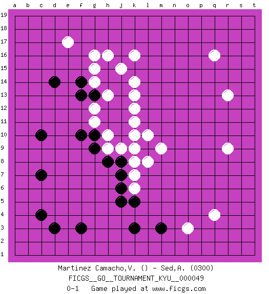 Last move : 0-1 2007 December 9 2:58:25 [Event "FICGS__GO__TOURNAMENT_KYU__000049"] [Site "FICGS"] [Date "2007.11.11"] [Round "1"] [Black "Martinez Camacho,Victor Hugo"] [White "Sed,Andres"] [Result "0-1"] [Rating 2 "0300"] 1.c4 q16 2.f3 k16 3.c7 r13 4.c10 q4 5.k3 r9 6.m3 o3 7.d3 e17 8.d14 k10 9.j13 k13 10.j12 k12 11.j11 k11 12.j10 k14 13.j14 j15 14.h15 h16 15.h14 l8 16.j8 k6 17.j6 g15 18.f14 g14 19.g13 g16 20.f13 j9 21.k9 h9 22.h8 k8 23.l9 m9 24.j7 l10 25.g9 k9 26.k5 k7 27.j5 h10 28.g10 g12 29.h11 h13 30.h12 g11 31.f10 h13 0-1 Here are the names of the openings (joseki) played in the four corners : Corner d16 : e17 d14 Mokuhazushi (Waemok, Wai`mu`) 5-3 Point. The mokuhazushi (5-3) point was popular in the Edo period in Japan (1600 - 1867). It emphasizes influence; territorially, it is inferior to the 3-4 point. Player White won this Go (weiqi, baduk) game. Follow this game move after move (download)Be a little patient. Keshi works ! (Anonymous) He who laughs last probably does not get the joke. (Unknown)