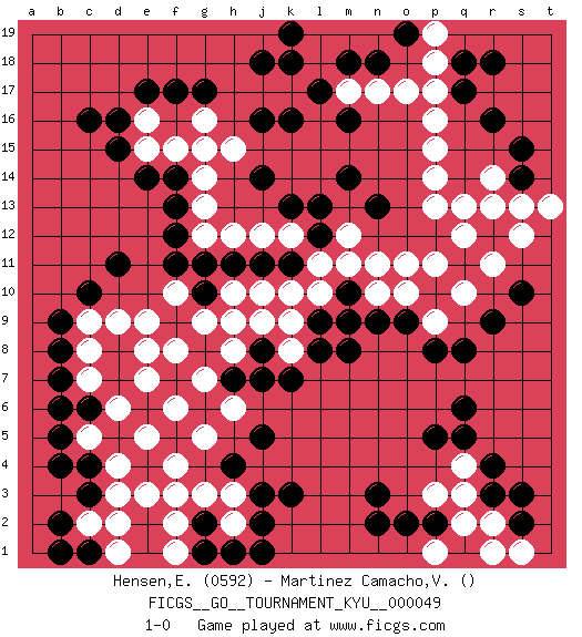 Last move : 1-0 2008 April 7 18:13:15 [Event "FICGS__GO__TOURNAMENT_KYU__000049"] [Site "FICGS"] [Date "2007.11.11"] [Round "1"] [Black "Hensen,Erik"] [White "Martinez Camacho,Victor Hugo"] [Result "1-0"] [Rating 1 "0592"] 1.r16 d3 2.d5 p16 3.d15 f3 4.m16 p14 5.r13 q13 6.r12 q12 7.r3 q10 8.e17 r11 9.d11 p15 10.q6 r14 11.s15 s13 12.s14 s12 13.n3 h3 14.q17 o17 15.j16 m17 16.l17 n17 17.j14 p17 18.d8 l18 19.c4 d4 20.k3 e5 21.b2 c5 22.b5 d6 23.c6 c7 24.b6 c8 25.d7 d9 26.f7 e8 27.b4 e7 28.k16 l19 29.c10 c9 30.h7 e9 31.k11 f6 32.f11 p18 33.r18 p19 34.j18 l11 35.l9 n11 36.c16 m11 37.n9 t13 38.j5 g7 39.n13 k12 40.q8 f8 41.r9 k10 42.j11 k9 43.l8 k8 44.k7 h8 45.m14 p13 46.l12 j12 47.h11 h12 48.j8 j9 49.k13 l10 50.j7 h9 51.k18 h10 52.g10 j10 53.g11 g12 54.f12 g13 55.f13 g14 56.f14 m12 57.l13 p11 58.j2 o11 59.g2 g3 60.b9 g15 61.g17 f15 62.b8 e3 63.s10 h2 64.h1 f2 65.g1 f1 66.j1 c2 67.c3 d2 68.c1 d1 69.b1 e15 70.e14 e16 71.d16 g16 72.f17 h15 73.k19 r13 74.m18 m19 75.n18 n19 76.o19 m9 77.m8 n10 78.o9 p9 79.p8 o10 80.j3 f4 81.h4 g5 82.q18 q3 83.r4 p3 84.m10 g9 85.p5 q4 86.n2 r2 87.s2 q2 88.o2 p1 89.q5 r1 90.p2 s1 91.s3 h6 92.b7 f10 93.m9 1-0 Here are the names of the openings (joseki) played in the four corners : Corner d4 : d3 d5 Komoku (Somok, Xiao~mu`) 3-4 Point. The komoku (3-4) point is the traditional corner enclosure move.. Ikken Takagakari (Hankan Nop'dakeolch'im, Yi Gaogua`jiao~, 1-Space High Approach). The 5-4 approach move has become more popular in modern times, as modern Go emphasizes speed and influence. Corner q16 : r16 p16 Komoku (Somok, Xiao~mu`) 3-4 Point. The komoku (3-4) point is the traditional corner enclosure move.. Ikken Takagakari (Hankan Nop'dakeolch'im, Yi Gaogua`jiao~, 1-Space High Approach). The 5-4 approach move has become more popular in modern times, as modern Go emphasizes speed and influence. Player Black won this Go (weiqi, baduk) game. Follow this game move after move (download)The rectangular six is normally alive. (Anonymous) Life is like a game of cards: the hand you are dealt represents determinism; the way you play it is free will. (Jawaharlal Nehru)