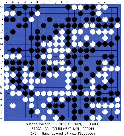 Last move : 1-0 2007 December 29 23:33:51 [Event "FICGS__GO__TOURNAMENT_KYU__000049"] [Site "FICGS"] [Date "2007.11.11"] [Round "1"] [Black "Suarez-Moreno,Alejandro"] [White "Sed,Andres"] [Result "1-0"] [Rating 1 "0750"] [Rating 2 "0300"] 1.q16 d4 2.q4 k4 3.c6 c5 4.d6 b6 5.b7 b5 6.c8 a7 7.a8 a6 8.g4 g5 9.e5 e4 10.f4 h4 11.h3 g3 12.f3 f5 13.j4 h5 14.k3 f2 15.g2 e3 16.e2 g3 17.j2 j5 18.j3 g1 19.l4 k5 20.m4 l3 21.m3 l2 22.m2 l1 23.m1 j1 24.k1 k2 25.k1 h2 26.d16 e6 27.d5 d7 28.c7 d8 29.c9 e8 30.e10 h8 31.q10 m5 32.n5 n7 33.m6 l5 34.n6 l6 35.m7 m8 36.n8 d9 37.d10 a9 38.b9 b8 39.b10 a8 40.a10 l7 41.m9 l8 42.l10 l9 43.n10 o8 44.o7 k10 45.l11 k11 46.k16 k12 47.j9 k9 48.g10 j8 49.g8 g7 50.f8 f7 51.e9 e7 52.h9 j10 53.h12 h10 54.g9 h11 55.g12 g11 56.f11 j12 57.h14 f12 58.e12 m10 59.m11 j14 60.j15 j13 61.l14 l12 62.m12 h13 63.f13 g13 64.g14 f12 65.g12 m13 66.l13 a11 67.b12 b11 68.c10 c11 69.c12 f14 70.e14 n11 71.n12 h15 72.f15 o12 73.o11 k15 74.j16 k14 75.l15 l16 76.m16 g15 77.f14 h16 78.h17 h12 79.f12 o5 80.o4 r17 81.q17 k13 82.g16 m15 83.l17 m14 84.l16 n13 85.o13 o14 86.p12 p13 87.o12 n15 88.n16 o16 89.o17 p16 90.p17 p15 91.q13 q15 92.r16 r15 93.s16 s15 94.s13 r14 95.r13 r3 96.r4 s3 97.s4 r2 98.t3 t2 99.s1 t4 100.t5 t3 101.s5 q3 102.p2 p3 103.o3 o2 104.n2 p1 105.o1 q1 106.p4 t16 107.t17 q18 108.p18 q19 109.p19 r19 110.s17 n17 111.n18 o18 112.m17 r9 113.q9 r8 114.s10 r10 115.s11 s9 116.s7 r7 117.r6 n19 118.o19 c17 119.c16 b16 120.b15 a15 121.a14 a16 122.b17 t9 123.r11 b18 124.a17 c19 125.d17 d18 126.e18 e19 127.c18 a18 128.d19 e17 129.b19 f18 130.f19 b3 131.t14 q8 132.p8 p7 133.o9 p6 134.q6 p5 135.q5 m19 136.l19 1-0 Here are the names of the openings (joseki) played in the four corners : Corner d4 : d4 c6 Hoshi (Hwajeom, Seongjeom, Xingwei`) 4-4 Point. The star or hoshi (4-4) point, emphasizing influence at the potential expense of territory. Ikken Kakari (Hankan Keolch'im, Yi Gua`jiao~, 1-Space Low Approach). Black 2 is the standard approach move to the 4-4. Player Black won this Go (weiqi, baduk) game. Follow this game move after move (download)Keep sente in the opening. A premature attack loses sente. (Anonymous) The Internet isn't free. It just has an economy that makes no sense to capitalism. (Brad Shapcott)