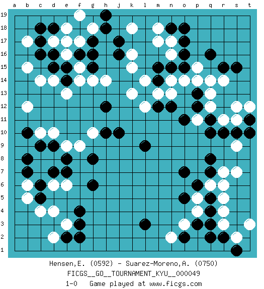 Last move : 1-0 2008 January 2 19:37:19 [Event "FICGS__GO__TOURNAMENT_KYU__000049"] [Site "FICGS"] [Date "2007.11.11"] [Round "1"] [Black "Hensen,Erik"] [White "Suarez-Moreno,Alejandro"] [Result "1-0"] [Rating 1 "0592"] [Rating 2 "0750"] 1.q16 e16 2.q4 d4 3.q10 d10 4.f4 e3 5.c6 d6 6.d7 e6 7.c5 c4 8.c16 d17 9.c17 c14 10.f3 b5 11.c9 c10 12.g6 c8 13.l3 k16 14.b8 d8 15.g8 q14 16.o16 n17 17.o17 n16 18.d18 e18 19.c18 b15 20.d15 d14 21.e15 f15 22.e14 e13 23.n15 o14 24.o7 r11 25.r10 s11 26.r15 r14 27.s10 h14 28.g15 f14 29.l9 m13 30.j10 g10 31.n18 m18 32.o18 m17 33.o15 p15 34.f16 f17 35.p13 p11 36.g16 g14 37.d16 e17 38.g17 g18 39.h18 f19 40.j17 k18 41.q11 q12 42.p12 q13 43.n12 n14 44.m15 p14 45.o11 l14 46.h19 r3 47.q3 r4 48.j16 k15 49.r2 s2 50.e2 d2 51.q2 r5 52.f2 s7 53.q7 r7 54.s15 p5 55.q5 q6 56.p6 r6 57.q8 s9 58.t11 t12 59.t10 s12 60.m14 n13 61.l13 l12 62.m12 k13 63.h10 b17 64.e7 c7 65.e8 e9 66.b7 b6 67.d9 f9 68.b10 b12 69.h12 o3 70.o5 p4 71.s1 t3 72.o2 n2 73.p3 1-0 Here are the names of the openings (joseki) played in the four corners : Corner d4 : d4 f4 Hoshi (Hwajeom, Seongjeom, Xingwei`) 4-4 Point. The star or hoshi (4-4) point, emphasizing influence at the potential expense of territory. Ikken Takagakari (Hankan Nop'dakeolch'im, Yi Gaojia, 1-Space High Approach). White typically responds at 6-4 or 3-10. White 4-10 is played when White finds play on the right side advantageous. White 4-8 or 3-8 may be played when White has support at top. Corner d16 : e16 c16 Takamoku (Gomok, Gaomu`) 5-4 Point. The takamoku (high) point (5-4). With its emphasis on influence, the 5-4 point complements the 4-4 (hoshi) point in creating an influence-oriented fuseki. Komoku. White responds with 3-3, 3-5, 4-6, 4-7, 3-6, 3-7. Corner q16 : q16 q14 Hoshi (Hwajeom, Seongjeom, Xingwei`) 4-4 Point. The star or hoshi (4-4) point, emphasizing influence at the potential expense of territory. Ikken Takagakari (Hankan Nop'dakeolch'im, Yi Gaojia, 1-Space High Approach). Black typically responds at 6-4 or 3-10. Black 4-10 is played when Black finds play on the right side advantageous. Black 4-8 or 3-8 may be played when Black has support at top. Player Black won this Go (weiqi, baduk) game. Follow this game move after move (download)Keep away from thickness. (Anonymous) Men never do evil so completely and cheerfully as when they do it from religious conviction. (Blaise Pascal)