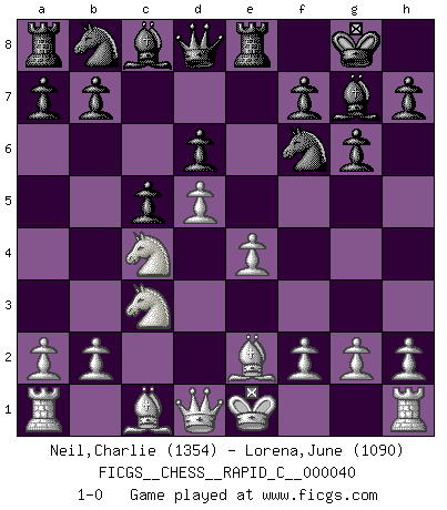 Last move : 1-0 2008 January 7 22:50:53 [Event "FICGS__CHESS__RAPID_C__000040"] [Site "FICGS"] [Date "2007.11.12"] [Round "1"] [White "Neil,Charlie"] [Black "Lorena,June"] [Result "1-0"] [WhiteElo "1354"] [BlackElo "1090"] 1.d4 Nf6 2.c4 e6 3.Nf3 c5 4.d5 exd5 5.cxd5 g6 6.Nc3 Bg7 7.e4 d6 8.Nd2 O-O 9.Nc4 Re8 10.Be2 1-0 This chess game has been lost on time (started : 2007.11.12 0:56:37) Queen's pawn game Kingside Castling by player Black (move 8) Player White won this chess game. Follow this game move after move (download)Only the player with the initiative has the right to attack. (Wilhelm Steinitz) Es gibt keine einzige Frau, der ich nicht einen Springer vorgeben könnte und trotzdem gewänne. (Robert James Fischer) Un sacrificio se refuta mucho mejor al aceptarlo. (Wilhelm Steinitz) Lorsque vous vous retrouvez devant une position atroce, ne tendez pas un ultime piège dérisoire avec l'intention d'abandonner si l'adversaire le déjoue ! Faites-vous plutôt un devoir de résister comme si votre vie en dépendait. Jouez le coup qui vous déplairait au centuple si vous étiez dans la peau de votre tortionnaire ! Unless I accept my faults I will most certainly doubt my virtues. (Hugh Prather)