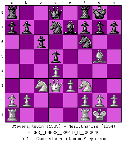 Last move : 0-1 2008 January 16 11:21:48 [Event "FICGS__CHESS__RAPID_C__000040"] [Site "FICGS"] [Date "2007.11.12"] [Round "1"] [White "Stevens,Kevin"] [Black "Neil,Charlie"] [Result "0-1"] [WhiteElo "1389"] [BlackElo "1354"] 1.d4 d5 2.c4 e6 3.Nc3 Nf6 4.cxd5 exd5 5.Bg5 Be7 6.Nf3 c6 7.e3 Bf5 8.Bd3 Bxd3 9.Qxd3 Nbd7 10.O-O O-O 0-1 This chess game has been lost on time (started : 2007.11.12 0:56:37) QGD : Exchange, positional line Kingside Castling by player White (move 10) Kingside Castling by player Black (move 10) Player Black won this chess game. Follow this game move after move (download)Every Pawn is a potential Queen. (James Mason) Schach ist Kampf, hauptsächlich jedoch gegen die eigenen Fehler. (Savielly Grigorievitsch Tartakower) El Ajedrez es como la guerra en un tablero. (Bobby Fischer) Je fais ceci parce que dans cinquante coups j'obtiendrai cela; je m'appelle Mikhail Moisevitch Botvinnik. (Botvinnik) The meaning of life is that it is to be lived, and it is not to be traded and conceptualized and squeezed into a pattern of systems. (Bruce Lee)