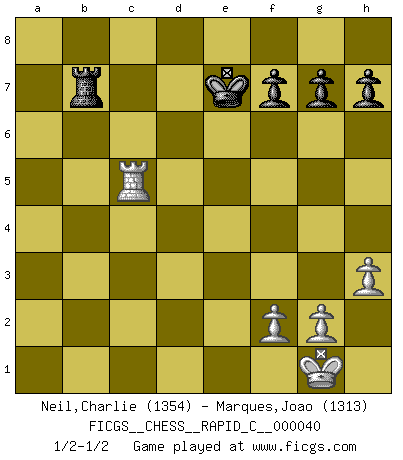 Last move : 1/2-1/2 2008 April 9 18:34:2 [Event "FICGS__CHESS__RAPID_C__000040"] [Site "FICGS"] [Date "2007.11.12"] [Round "1"] [White "Neil,Charlie"] [Black "Marques,Joao"] [Result "1/2-1/2"] [WhiteElo "1354"] [BlackElo "1313"] 1.d4 Nf6 2.c4 e6 3.Nf3 d5 4.Bg5 Be7 5.e3 O-O 6.Nc3 c5 7.Bxf6 Bxf6 8.cxd5 cxd4 9.exd4 exd5 10.Bd3 Nc6 11.O-O Bg4 12.h3 Bh5 13.Be2 Bxf3 14.Bxf3 Nxd4 15.Bxd5 Rb8 16.Bf3 b6 17.Bg4 Nc6 18.Qb3 Na5 19.Qb4 Rb7 20.Rad1 Bxc3 21.Qxc3 Qc7 22.Qxc7 Rxc7 23.Rd7 Rxd7 24.Bxd7 Rd8 25.Bb5 Nb7 26.Re1 Kf8 27.a4 Nc5 28.b4 a6 29.bxc5 axb5 30.axb5 bxc5 31.Rc1 Rc8 32.b6 Ke7 33.b7 Rb8 34.Rxc5 Rxb7 1/2-1/2 Queen's pawn game Kingside Castling by player Black (move 5) Kingside Castling by player White (move 11) 10 pieces endgame at move 34 : White KRPPP , Black KRPPP WHITE : King + 1 Rook 3 Pawns BLACK : King + 1 Rook 3 Pawns This chess game ended in a draw. Follow this game move after move (download)Chess is like life. (Boris Spassky) Es tut gut, die Entwicklungsperiode von, [...] demokratischem Geist durchdringen zu lassen. Wie undemokratisch wäre es doch beispielsweise, den einen Offizier große Spaziertouren vornehmen zu lassen, während die anderen zu Hause säßen und sich entsetzlich langweilten. (Aaron Nimzowitsch) Yo no creo en la psicología. Yo creo en las buenas movidas. (Bobby Fischer) J'ai toujours senti une vague pitié pour l'homme qui ne connaît rien aux échecs, tout comme j'en aurais pour un homme ignorant de l'amour. Les Echecs, comme la musique ou comme l'amour, ont le pouvoir de rendre heureux. (Siegbert Tarrasch) Memory is a complicated thing, a relative to truth, but not its twin. (Barbara Kingsolver, Animal Dreams)