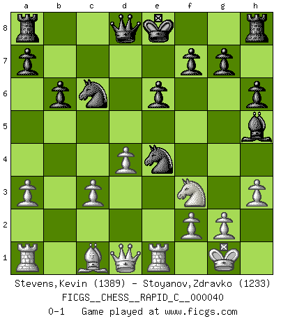 Last move : 0-1 2007 December 29 22:6:33 [Event "FICGS__CHESS__RAPID_C__000040"] [Site "FICGS"] [Date "2007.11.12"] [Round "1"] [White "Stevens,Kevin"] [Black "Stoyanov,Zdravko"] [Result "0-1"] [WhiteElo "1389"] [BlackElo "1233"] 1.d4 d5 2.c4 b6 3.cxd5 Qxd5 4.Nc3 Qd8 5.e4 h6 6.Nf3 Bg4 7.Be2 e6 8.O-O Nf6 9.h3 Bh5 10.Re1 Bb4 11.a3 Bxc3 12.bxc3 Nxe4 13.Bb5+ c6 14.Bxc6+ Nxc6 0-1 This chess game has been lost on time (started : 2007.11.12 0:56:37) Queen's Gambit Kingside Castling by player White (move 8) Player Black won this chess game. Follow this game move after move (download)The passed Pawn is a criminal, who should be kept under lock and key. Mild measures, such as police surveillance, are not sufficient. (Aaron Nimzovich) Rubinstein ist ein Turmendspiel, welches die Götter vor tausenden von Jahren begannen. (Savielly Grigorievitsch Tartakower) No hay un Gran Maestro de Ajedrez que sea normal; solo se diferencían ellos por la magnitud de su locura. (Viktor Korchnoi) Vous n'êtes pas toujours obligé de jouer le meilleur coup. Un coup doit être actif, entreprenant, correct et beau ! (David Bronstein) Creativity is allowing yourself to make mistakes. Art is knowing which ones to keep. (Scott Adams)