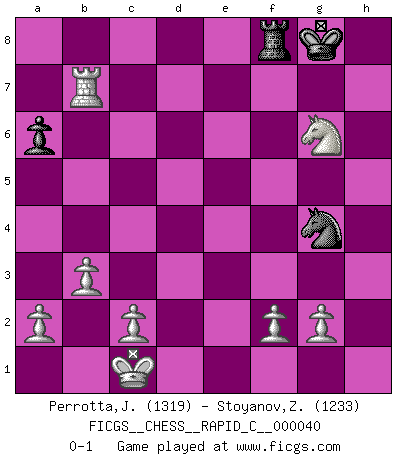 Last move : 0-1 2008 February 9 0:53:3 [Event "FICGS__CHESS__RAPID_C__000040"] [Site "FICGS"] [Date "2007.11.12"] [Round "1"] [White "Perrotta,John Zach"] [Black "Stoyanov,Zdravko"] [Result "0-1"] [WhiteElo "1319"] [BlackElo "1233"] 1.e4 e5 2.Nf3 d6 3.d4 Be7 4.dxe5 dxe5 5.Qxd8+ Bxd8 6.Nxe5 Bf6 7.Nf3 Ne7 8.e5 Nd7 9.exf6 Nxf6 10.Bc4 Be6 11.Bxe6 fxe6 12.Bg5 O-O 13.Nc3 Nc6 14.Bxf6 Rxf6 15.O-O-O a6 16.Rd7 Rf7 17.Rhd1 Raf8 18.b3 Rxd7 19.Rxd7 Rc8 20.Ng5 Ne5 21.Re7 Ng4 22.Nxe6 g6 23.Rxc7 Re8 24.Nf4 Nxh2 25.Ncd5 Rf8 26.Rxb7 Ng4 27.Ne7+ Kh8 28.Nexg6+ hxg6 29.Nxg6+ Kg8 0-1 This chess game has been lost on time (started : 2007.11.12 0:56:37) Philidor's defense Kingside Castling by player Black (move 12) Queenside Castling by player White (move 15) Player Black won this chess game. Follow this game move after move (download)You cannot play at Chess if you are kind-hearted. (French Proverb) Ich liebe den Moment, wenn ich das Ego meines Gegenüber breche. (Robert James Fischer) Creo que una cierta cantidad de temperamento es esperada de los genios del Ajedrez. (Ron Gross) Que feriez-vous si vous étiez en train de jouer aux échecs et que la fin du monde arrive ? Je continuerais à jouer. (Saint Borromée) Children in the dark cause accidents, accidents in the dark cause children. (Unknown)