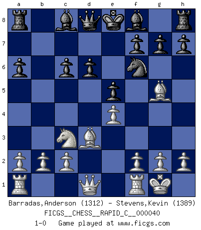 Last move : 1-0 2007 December 28 9:57:21 [Event "FICGS__CHESS__RAPID_C__000040"] [Site "FICGS"] [Date "2007.11.12"] [Round "1"] [White "Barradas,Anderson"] [Black "Stevens,Kevin"] [Result "1-0"] [WhiteElo "1312"] [BlackElo "1389"] 1.e4 c5 2.Nf3 d6 3.d4 cxd4 4.Nxd4 Nf6 5.Nc3 a6 6.Bd3 Nc6 7.Nxc6 bxc6 8.O-O e5 9.Bg5 1-0 This chess game has been lost on time (started : 2007.11.12 0:56:37) Sicilian : Najdorf Kingside Castling by player White (move 8) Player White won this chess game. Follow this game move after move (download)There just isn't enough televised Chess. (David Letterman) Im Wettkampf zwischen starken Meistern kommen Fehler sehr selten vor, deshalb ist es mit bloßem Warten nicht getan. (José Raúl Capablanca) Tu sabes, camarada Pachman, no disfruto el ser un Ministro, preferería jugar al Ajedrez como tu. (Che Guevara) Les écrivains ont utilisé les échecs pour analyser les côtés extrêmes de la nature humaine. Dans ce cadre, les échecs offrent un champ d'expérimentation idéal. Mais on pourrait faire la même chose avec la peinture. Et là, en vous référant à Van Gogh, vous ne tirerez pas de conclusion définitive sur les peintres. (Gary Kasparov) As a goal marker shodan is important. As a destination it is a poor place to stop. (Thomas Tamayo)