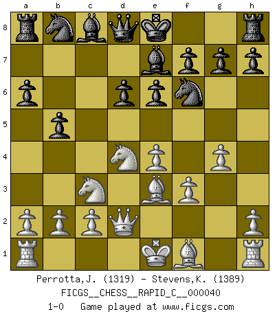 Last move : 1-0 2008 January 22 11:36:38 [Event "FICGS__CHESS__RAPID_C__000040"] [Site "FICGS"] [Date "2007.11.12"] [Round "1"] [White "Perrotta,John Zach"] [Black "Stevens,Kevin"] [Result "1-0"] [WhiteElo "1319"] [BlackElo "1389"] 1.e4 c5 2.Nf3 d6 3.d4 cxd4 4.Nxd4 Nf6 5.Nc3 a6 6.Be3 e6 7.f3 b5 8.Qd2 Be7 9.g4 1-0 This chess game has been lost on time (started : 2007.11.12 0:56:37) Sicilian : Najdorf, Byrne (English) attack Player White won this chess game. Follow this game move after move (download)Via the squares on the chessboard, the Indians explain the movement of time and the age, the higher influences which control the world and the ties which link Chess with the human soul. (Al-Masudi) Es ist besser die Steine des Gegners zu opfern. (Savielly Grigorievitsch Tartakower) Si el Ajedrez es una ciencia, es la mas inexacta. Si el Ajedrez es un arte, es demasiado inexacto para ser visto como tal. Si el Ajedrez es un deporte, es demasiado esotérico. Si el Ajedrez es un juego, es demasiado exigente para ser solo un juego. Si el Ajedrez es una aventura, es una muy demandante. Si el Ajedrez es una pasión, es una muy gratificante. Si el Ajedrez es la vida, es una muy triste. (Anónimo) Le profane ne songe pas à la somme de jouissance dont il se prive, qui méconnaît ce jeu aux ressources aussi variées que passionnantes. (Jean-Marie Jeanton-Lamarche) There are more things in heaven and earth than practically anywhere else. (Unknown)