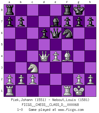Last move : 1-0 2008 February 26 14:38:32 [Event "FICGS__CHESS__CLASS_D__000068"] [Site "FICGS"] [Date "2007.11.12"] [Round "1"] [White "Piek,Johann"] [Black "Nebout,Louis"] [Result "1-0"] [WhiteElo "1551"] [BlackElo "1581"] 1.e4 c5 2.f4 d6 3.Nc3 Nc6 4.Bb5 Bd7 5.Nf3 e6 6.d4 cxd4 7.Nxd4 Nxd4 8.Bxd7+ Qxd7 9.Qxd4 Nf6 10.O-O Be7 11.f5 O-O 12.fxe6 Qxe6 13.Bf4 1-0 This chess game has been lost on time (started : 2007.11.12 11:13:43) Sicilian : Grand Prix attack Kingside Castling by player White (move 10) Kingside Castling by player Black (move 11) Player White won this chess game. Follow this game move after move (download)In order to improve your game, you must study the endgame before everything else, for whereas the endings can be studied and mastered by themselves, the middle game and the opening must be studied in relation to the endgame. (Jose Raul Capablanca) Ich möchte Schüler heranbilden, die das Vermögen haben, selbst zu denken und Kritik zu üben. (Emanuel Lasker) Muchos jugadores de Ajedrez se sorprendían cuando después de la partida, Fischer explicaba con calma: 'Yo ya había analizado esta posibilidad' en una posición en la cual yo creía que no era posible de prever desde la apertura. (Mikhail Tal) Psychologiquement, tu dois avoir confiance en toi même, mais cette confiance doit être basée sur des faits. (Robert Fischer) Do you know these so called Volunteers don't even get paid! (Simpsons)