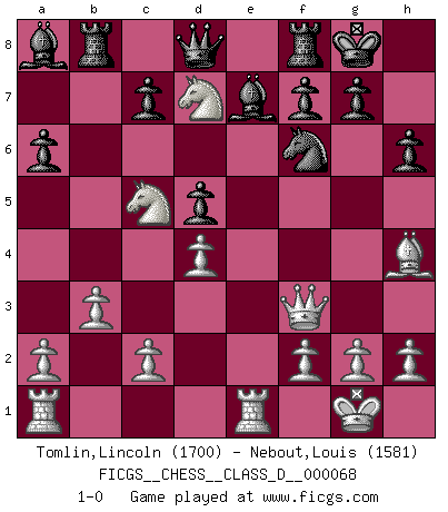 Last move : 1-0 2007 December 7 22:28:12 [Event "FICGS__CHESS__CLASS_D__000068"] [Site "FICGS"] [Date "2007.11.12"] [Round "1"] [White "Tomlin,Lincoln"] [Black "Nebout,Louis"] [Result "1-0"] [WhiteElo "1700"] [BlackElo "1581"] 1.e4 e5 2.Nf3 Nc6 3.Bb5 a6 4.Ba4 Nf6 5.O-O Be7 6.Re1 O-O 7.Bxc6 bxc6 8.Nxe5 Re8 9.d4 Bb7 10.Nc3 d5 11.exd5 cxd5 12.Qf3 Bb4 13.Bg5 Be7 14.Na4 h6 15.Bh4 Rb8 16.b3 Rf8 17.Nc5 Ba8 18.Ned7 1-0 Ruy Lopez : Closed defense Kingside Castling by player White (move 5) Kingside Castling by player Black (move 6) Player White won this chess game. Follow this game move after move (download)Fischer Chess play was always razor-sharp, rational and brilliant. One of the best ever. (Dave Regis) Der Bart als Geschlechtszeichen mitten im Gesicht ist obszön. Daher gefällt er den Weibern. [Zugegeben, kein Schachzitat, aber unglaublich originell] (Arthur Schopenhauer) El Ajedrez es la vida. (Bobby Fischer) Avec des compensations pour le matériel en plus... (Anonyme) We need strong personalities and only one world champion to attract sponsors. (Anatoly Karpov)