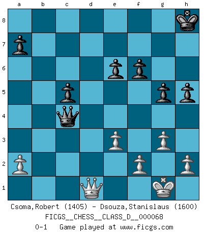 Last move : 0-1 2008 April 14 7:43:39 [Event "FICGS__CHESS__CLASS_D__000068"] [Site "FICGS"] [Date "2007.11.12"] [Round "1"] [White "Csoma,Robert"] [Black "Dsouza,Stanislaus"] [Result "0-1"] [WhiteElo "1405"] [BlackElo "1600"] 1.Nf3 d5 2.d4 Nf6 3.c4 e6 4.Nc3 Bb4 5.g3 Ne4 6.Qc2 O-O 7.Bg2 Nxc3 8.bxc3 Be7 9.O-O c5 10.Bf4 Nc6 11.Ne5 Nxe5 12.Bxe5 f6 13.Bf4 g5 14.Be3 Kh8 15.Rab1 b6 16.Qb3 Bb7 17.cxd5 Bxd5 18.Bxd5 Qxd5 19.c4 Qe4 20.dxc5 Bxc5 21.Bxc5 bxc5 22.e3 Rfd8 23.Rfd1 h5 24.Rxd8+ Rxd8 25.Rd1 Rxd1+ 26.Qxd1 Qxc4 0-1 This chess game has been lost on time (started : 2007.11.12 11:13:43) Reti Opening Kingside Castling by player Black (move 6) Kingside Castling by player White (move 9) Player Black won this chess game. Follow this game move after move (download)Chess is a cold bath for the mind. (Sir John Simon) Ohne Leiden bildet sich kein Charakter. (Ernst Freiherr von Feuchtersleben) Yo siempre he tenido un ligero sentimiento de lástima por una persona que no tiene conocimiento del Ajedrez. (Siegbert Tarrasch) Aux échecs, les retours au sommet sont rares : les dommages psychologiques consécutifs à une défaite sont trop sévères. (Daily Telegraph) There are lots of people who mistake their imagination for their memory. (Josh Bilings)