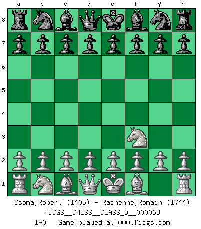 Last move : 1-0 2007 December 23 21:43:58 [Event "FICGS__CHESS__CLASS_D__000068"] [Site "FICGS"] [Date "2007.11.12"] [Round "1"] [White "Csoma,Robert"] [Black "Rachenne,Romain"] [Result "1-0"] [WhiteElo "1405"] [BlackElo "1744"] 1.Nf3 1-0 This chess game has been lost on time (started : 2007.11.12 11:13:43) Reti Opening Player White won this chess game. Follow this game move after move (download)Bobby Fischer is the greatest Chess player who has ever lived. (Ken Smith) Ich würde mich als ganz normalen Jungen bezeichnen [Im Alter von 12]. (Sergej Karjakin) El pensamiento metódico es mas útil en el Ajedrez que la inspiración. (C. J. S. Purdy) Les Cavaliers se révèlent fort utiles dans les positions fermées. D'habitude, les Fous sont un peu plus forts que les Cavaliers dans les positions ouvertes. Qu'on le veuille ou non, il restera toujours des exceptions ! Always two there are. No more no less. A master, and an apprentice. (Master Yoda in Star Wars ep.1)