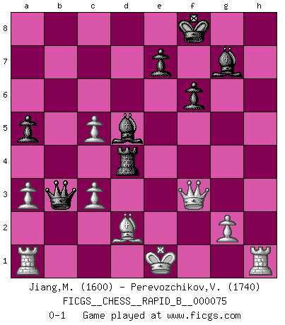 Last move : 0-1 2008 February 25 14:38:16 [Event "FICGS__CHESS__RAPID_B__000075"] [Site "FICGS"] [Date "2007.11.13"] [Round "1"] [White "Jiang,Matthew"] [Black "Perevozchikov,Vjacheslav"] [Result "0-1"] [WhiteElo "1600"] [BlackElo "1740"] 1.e4 g6 2.d4 Bg7 3.Nc3 d6 4.f4 Nf6 5.Nf3 O-O 6.Bd3 Nc6 7.e5 dxe5 8.fxe5 Nd5 9.Nxd5 Qxd5 10.c3 f6 11.Qe2 Be6 12.h4 Rfd8 13.h5 Nxe5 14.Be4 Nxf3+ 15.Qxf3 Qa5 16.hxg6 hxg6 17.b4 Qb5 18.Bxg6 Bf7 19.Bh7+ Kf8 20.Be4 Qc4 21.Bxb7 Rab8 22.Be4 a5 23.a3 c5 24.bxc5 Rb3 25.Bd2 Rxd4 26.Bc2 Bd5 27.Bxb3 Qxb3 0-1 This chess game has been lost on time (started : 2007.11.13 19:12:29) Robatsch defense : Pseudo-Austrian attack Kingside Castling by player Black (move 5) Player Black won this chess game. Follow this game move after move (download)You have to have the fighting spirit. You have to force moves and take chances. (Bobby Fischer) Kleine Schachspieler machen Mist, und große Schachspieler machen Mist, aber große machen weniger Mist. (Fritz Sämisch) Preferería tener un Peón que un dedo. (Reuben Fine) Même si l'adversaire joue le coup analysé précédemment, recommencez l'analyse en voyant la nouvelle position. Première règle de Blumenfeld Quotation,n.: The act of repeating erroneously the words of another. The words erroneously repeated. (Ambrose Bierce, The Devil's Dictionary)