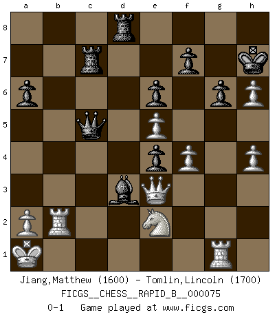 Last move : 0-1 2007 December 19 16:58:0 [Event "FICGS__CHESS__RAPID_B__000075"] [Site "FICGS"] [Date "2007.11.13"] [Round "1"] [White "Jiang,Matthew"] [Black "Tomlin,Lincoln"] [Result "0-1"] [WhiteElo "1600"] [BlackElo "1700"] 1.e4 e6 2.d4 d5 3.Nc3 Nf6 4.Bg5 Be7 5.e5 Nfd7 6.Bxe7 Qxe7 7.f4 a6 8.Nf3 c5 9.Qd2 Nc6 10.O-O-O b5 11.dxc5 Nxc5 12.Bd3 h6 13.Kb1 O-O 14.Ne2 Bb7 15.Ned4 Ne4 16.Qe3 Nxd4 17.Nxd4 Rfc8 18.Rhf1 Rc7 19.g4 Rac8 20.Bxe4 dxe4 21.Rg1 Kh7 22.Qg3 Qc5 23.g5 g6 24.gxh6 Rd8 25.Qe3 Rcd7 26.c3 b4 27.h4 bxc3 28.bxc3 Bd5 29.Rd2 Rc7 30.Rc2 Bc4 31.Ka1 Bd3 32.Rb2 Qxc3 33.Ne2 Qc5 0-1 French : Classical, Steinitz variation Queenside Castling by player White (move 10) Kingside Castling by player Black (move 13) Player Black won this chess game. Follow this game move after move (download)Fischer, who may or may not be mad as a hatter, has every right to be horrified. (Jeremy Silman) Ein Springer auf f6 gegen die eigene Rochadestellung ist schlimmer als ein rostiger Nagel im Knie. (Efim Bogoljubov) Fischer sacrificó virtualmente todo lo que la mayoría de nosotros los 'debiles' (término que él usa) valoramos, respetamos y apreciamos por el amor de un astuto, a menudo hermoso tablero de juego, por el privilegio ambivalente de ser su mas grande maestro. (Paul Kollar) Les échecs, c'est l'imagination. (David Bronstein) Political correctness is subjecting us to gross incompetence. (Johann Piek)