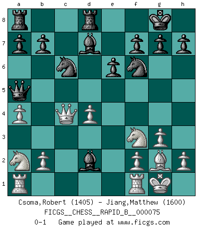 Last move : 0-1 2007 December 17 20:47:5 [Event "FICGS__CHESS__RAPID_B__000075"] [Site "FICGS"] [Date "2007.11.13"] [Round "1"] [White "Csoma,Robert"] [Black "Jiang,Matthew"] [Result "0-1"] [WhiteElo "1405"] [BlackElo "1600"] 1.Nf3 d5 2.d4 Nf6 3.c4 c6 4.Nc3 e6 5.g3 dxc4 6.a4 c5 7.Bg2 Nc6 8.e3 cxd4 9.exd4 Bb4 10.O-O Qa5 11.Bd2 O-O 12.Qe2 Rd8 13.Qxc4 Bd7 14.Na2 Bxd2 0-1 Reti Opening Kingside Castling by player White (move 10) Kingside Castling by player Black (move 11) Player Black won this chess game. Follow this game move after move (download)Chess is as much a mystery as women. (Purdy) Wie ich sie so einen nach dem anderen nieder mähte wurde meine Überlegenheit offensichtlich. (José Raúl Capablanca) El Ajedrez es la vida. (Bobby Fischer) Je crois qu'il existe des manières très spécifiques de jouer efficacement contre une machine. Evidemment, nous n'avons aucune chance en technique pure, parce que l'ordinateur calcule de manière parfaite. Mais lorsque nous faisons appel à notre cerveau, en utilisant l'intuition et la compréhension, alors nous restons beaucoup plus forts. (Anatoli Karpov) The best teachers teach from the heart, not from the book. (Author unknown)