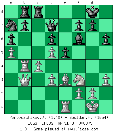 Last move : 1-0 2008 February 1 15:46:54 [Event "FICGS__CHESS__RAPID_B__000075"] [Site "FICGS"] [Date "2007.11.13"] [Round "1"] [White "Perevozchikov,Vjacheslav"] [Black "Gouldar,Frances"] [Result "1-0"] [WhiteElo "1740"] [BlackElo "1654"] 1.e4 e5 2.Bc4 Nf6 3.d3 Nc6 4.Nf3 Be7 5.O-O O-O 6.Re1 d6 7.a4 Bg4 8.c3 Qd7 9.h3 Be6 10.Na3 Bxc4 11.Nxc4 a6 12.a5 Qe6 13.Qb3 Rab8 14.Ng5 Qd7 15.Ne3 h6 16.Nf3 Rfe8 17.Bd2 Nd8 18.Rad1 c5 19.Qa2 Nc6 20.Rb1 Rbd8 21.Nd5 Nxd5 22.exd5 Na7 23.b4 cxb4 24.c4 Bf6 25.Rxb4 Rb8 26.Qb3 Rec8 27.Be3 1-0 Bishop's Opening : Berlin defense Kingside Castling by player White (move 5) Kingside Castling by player Black (move 5) Player White won this chess game. Follow this game move after move (download)Alekhine is a poet who creates a work of art out of something that would hardly inspire another man to send home a picture post card. (Max Euwe) Bobby Fischer ist kein Vorbild für die heutige Jugend. (Viktor Kortschnoi) Una partida de Ajedrez se divide en 3 etapas: la primera cuando piensas que tienes la ventaja, la segunda cuando crees que tienes la ventaja y la tercera... ¡cuando te das cuenta que vas a perder!. (Savielly Tartakower) Tout change constamment, y compris dans le monde des Echecs. (Botvinnik) The ultimate in disposing one's troops is to be without ascertainable shape. Then the most penetrating spies cannot pry in nor can the wise lay plans against you. (Sun Tzu)