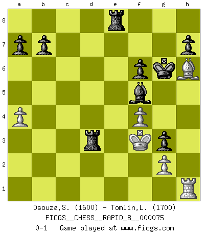 Last move : 0-1 2007 November 27 15:18:40 [Event "FICGS__CHESS__RAPID_B__000075"] [Site "FICGS"] [Date "2007.11.13"] [Round "1"] [White "Dsouza,Stanislaus"] [Black "Tomlin,Lincoln"] [Result "0-1"] [WhiteElo "1600"] [BlackElo "1700"] 1.d4 d5 2.Nf3 Nf6 3.e3 e6 4.Nbd2 c5 5.c3 Bd6 6.Bd3 Nc6 7.O-O O-O 8.e4 cxd4 9.Nxd4 Nxd4 10.cxd4 dxe4 11.Nxe4 Nxe4 12.Bxe4 Bxh2+ 13.Kxh2 Qh4+ 14.Kg1 Qxe4 15.Re1 Qd5 16.Re5 Qd6 17.Qg4 f6 18.Rh5 e5 19.Qe4 g6 20.Rh4 Qxd4 21.Qxd4 exd4 22.Rxd4 Be6 23.Bh6 Rfc8 24.Re1 Kf7 25.Red1 g5 26.f4 g4 27.Kf2 Rc2+ 28.Kg3 Rxb2 29.a4 Kg6 30.Rh1 Rb3+ 31.Kf2 g3+ 32.Ke2 Bf5 33.Rd6 Rb2+ 34.Ke3 Re8+ 35.Kf3 Rb3+ 36.Rd3 Rxd3+ 0-1 Queen's pawn game Kingside Castling by player White (move 7) Kingside Castling by player Black (move 7) Player Black won this chess game. Follow this game move after move (download)I played Chess with him and would have beaten him sometimes only he always took back his last move, and ran the game out differently. (Mark Twain) Im Schach nämlich geht es darum, daß Ich des Gegners klein zu kriegen, sein Ego zu zerbrechen und zu zermahlen, seine Selbstachtung zu zertreten und zu verscharren und seine ganze mißachtenswerte sogenannte Persönlichkeit ein für alle Mal tot zu hacken und zu zerstampfen und dadurch die menschliche Gesellschaft von einer stinkenden Pestbeule zu befreien. Es ist ein königliches Spiel. (Robert James Fischer) El Ajedrez es tan interesante por sí solo, que no es necesario un interés monetario para persuadir a una persona a que lo practique; por lo tanto, nunca se juega por dinero. (Benjamin Franklin) Votre seul travail dans les ouvertures est d'obtenir un milieu de partie jouable. (Lajos Portish) There are 10 types of people in this world: those who understand binary and those who don't. (Anonymous)