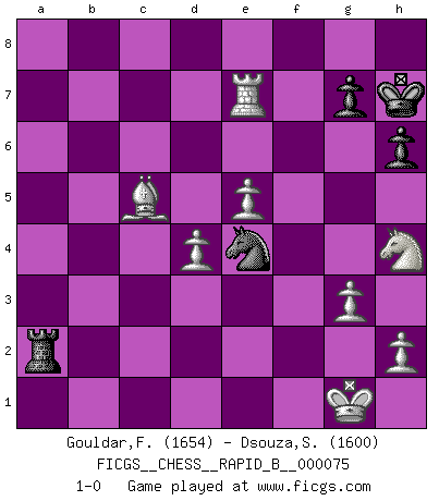 Last move : 1-0 2008 January 22 16:39:45 [Event "FICGS__CHESS__RAPID_B__000075"] [Site "FICGS"] [Date "2007.11.13"] [Round "1"] [White "Gouldar,Frances"] [Black "Dsouza,Stanislaus"] [Result "1-0"] [WhiteElo "1654"] [BlackElo "1600"] 1.d4 d5 2.c4 c6 3.cxd5 Qxd5 4.Nc3 Qd8 5.Bf4 Bf5 6.e4 Bg6 7.Nf3 e6 8.Bd3 Bb4 9.O-O Ne7 10.e5 Nd7 11.Bxg6 Nxg6 12.Bd2 O-O 13.a3 Ba5 14.Re1 Qc7 15.b4 Bb6 16.Na4 a5 17.Nxb6 Nxb6 18.bxa5 Nd5 19.Rb1 b6 20.axb6 Nxb6 21.Bb4 Rfd8 22.a4 Rxa4 23.Bd6 Qa7 24.Rxb6 Qxb6 25.Qxa4 Nf4 26.Bc5 Qb2 27.Qxc6 Nd3 28.Rf1 h6 29.Qb6 Qxb6 30.Bxb6 Rb8 31.Bc7 Rc8 32.Bd6 Nf4 33.g3 Ne2+ 34.Kg2 Rc4 35.Bc5 Rc2 36.Ra1 Kh7 37.Ra7 Kg6 38.Nh4+ Kh7 39.Rxf7 Nc3 40.Re7 Ne4 41.Rxe6 Rxf2+ 42.Kg1 Ra2 43.Re7 1-0 QGD Slav defense : Exchange variation Kingside Castling by player White (move 9) Kingside Castling by player Black (move 12) Player White won this chess game. Follow this game move after move (download)Play the opening like a book, the middle game like a magician, and the endgame like a machine. (Spielmann) Jede Eröffnung ist gut genug um gespielt zu werden, wenn nur ihr Ruf schlecht genug ist. (Savielly Grigorievitsch Tartakower) No puedes jugar al Ajedrez si eres de corazón noble. (Proverbio Francés) Un journaliste : 'Vous préférez avoir une dame de plus sur l'échiquier ou au lit ?' Boris Spassky : 'Ca dépend de la position.' If things go wrong, don't go with them. (Roger Babson)