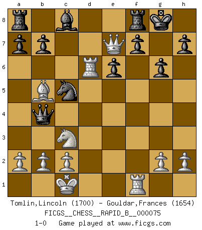 Last move : 1-0 2007 November 29 16:7:44 [Event "FICGS__CHESS__RAPID_B__000075"] [Site "FICGS"] [Date "2007.11.13"] [Round "1"] [White "Tomlin,Lincoln"] [Black "Gouldar,Frances"] [Result "1-0"] [WhiteElo "1700"] [BlackElo "1654"] 1.e4 c5 2.Nc3 d6 3.Nf3 Nc6 4.d4 cxd4 5.Nxd4 Nf6 6.Bg5 e6 7.Qd2 Be7 8.O-O-O Nxd4 9.Qxd4 O-O 10.e5 dxe5 11.Qxe5 Qb6 12.Be2 Nd7 13.Qg3 Bxg5+ 14.Qxg5 Qxf2 15.Rhf1 Qc5 16.Qg3 Qe5 17.Qh4 Qa5 18.Bd3 g6 19.Bb5 Nc5 20.Qe7 Qb4 21.Rd6 1-0 Sicilian : Closed Queenside Castling by player White (move 8) Kingside Castling by player Black (move 9) Player White won this chess game. Follow this game move after move (download)My God, Bobby Fischer plays so simply. (Alexei Suetin) Ich glaube, ich kenne inzwischen die Gründe für mein Versagen: schachliche Charakterfehler. Ich war nie ein Wunderkind und in meiner gesamten menschlichen Entwicklung immer zu langsam. (Viktor Kortschnoi) Fischer sacrificó virtualmente todo lo que la mayoría de nosotros los 'debiles' (término que él usa) valoramos, respetamos y apreciamos por el amor de un astuto, a menudo hermoso tablero de juego, por el privilegio ambivalente de ser su mas grande maestro. (Paul Kollar) Donnez-moi un Cavalier en 6e et je gagnerais toutes mes parties. (Steinitz) History is a gallery of pictures in which there are few originals and many copies. (Alexis de Tocqueville)