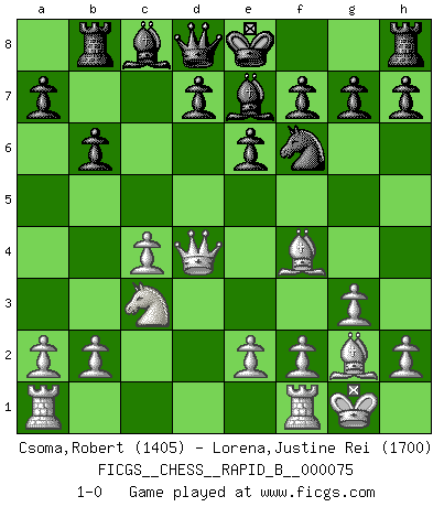 Last move : 1-0 2008 January 3 10:21:21 [Event "FICGS__CHESS__RAPID_B__000075"] [Site "FICGS"] [Date "2007.11.13"] [Round "1"] [White "Csoma,Robert"] [Black "Lorena,Justine Rei"] [Result "1-0"] [WhiteElo "1405"] [BlackElo "1700"] 1.Nf3 c5 2.c4 Nc6 3.Nc3 Nf6 4.g3 e6 5.Bg2 b6 6.O-O Be7 7.d4 cxd4 8.Nxd4 Nxd4 9.Qxd4 Rb8 10.Bf4 1-0 This chess game has been lost on time (started : 2007.11.13 19:12:29) Reti Opening Kingside Castling by player White (move 6) Player White won this chess game. Follow this game move after move (download)The winner of the game is the player who makes the next-to-last mistake. (Savielly Tartakover) Ich las kürzlich ein Buch von Nietzsche. Er sagte Religion verdumme nur die Menschen. Ich stimme zu. (Robert James Fischer) El Ajedrez es una hermosa aventura. (Bent Larsen) Même un GMI sait rarement calculer sur plus de cinq coups une attaque à sacrifices. (Rudolf Spielmann) Logic : The art of thinking and reasoning in strict accordance with the limitations and incapacities of the human misunderstanding. (Ambrose Bierce)