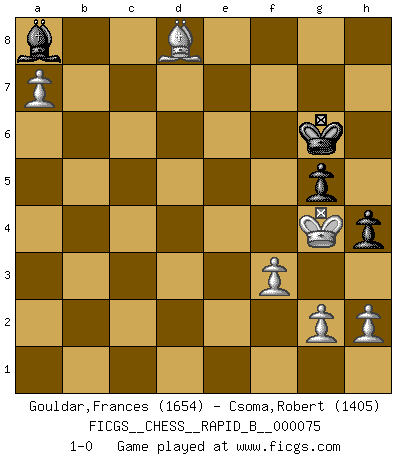 Last move : 1-0 2008 February 26 10:47:4 [Event "FICGS__CHESS__RAPID_B__000075"] [Site "FICGS"] [Date "2007.11.13"] [Round "1"] [White "Gouldar,Frances"] [Black "Csoma,Robert"] [Result "1-0"] [WhiteElo "1654"] [BlackElo "1405"] 1.c4 Nf6 2.d4 c5 3.d5 e6 4.dxe6 fxe6 5.Bf4 d5 6.e3 Nc6 7.cxd5 exd5 8.Nf3 Be7 9.Be2 O-O 10.O-O Qb6 11.b3 Bf5 12.Nc3 Rad8 13.Ne5 Be6 14.Nxc6 Qxc6 15.Re1 d4 16.exd4 Rxd4 17.Bb5 Rxd1 18.Bxc6 Rxa1 19.Rxa1 bxc6 20.Re1 Bxb3 21.Rxe7 Bd5 22.Rxa7 Re8 23.f3 Nh5 24.Bd6 c4 25.a4 Re3 26.Bb4 h6 27.a5 Nf4 28.Re7 Rxe7 29.Bxe7 Be6 30.a6 Bc8 31.a7 Bb7 32.Bd6 Nd5 33.Be5 Kf7 34.Ne4 Ba8 35.Nd6+ Ke6 36.Nxc4 g6 37.Bd4 h5 38.Kf2 g5 39.Kg3 h4+ 40.Kg4 c5 41.Bxc5 Kf6 42.Nb6 Nxb6 43.Bxb6 Kg6 44.Bd8 1-0 English, 1...Nf6 (Anglo-Indian defense) Kingside Castling by player Black (move 9) Kingside Castling by player White (move 10) 10 pieces endgame at move 43 : White KBPPPP , Black KBPP WHITE : King + 1 Bishop 4 Pawns BLACK : King + 1 Bishop 2 Pawns Player White won this chess game. Follow this game move after move (download)He who takes the Queen's Knight's Pawn will sleep in the streets. (Anonymous) Besser ein falscher Plan, logisch durchgeführt, als gar kein Plan. (Viktor Kortschnoi) Todo se encuentra en un estado de flujo y esto incluye al mundo del Ajedrez. (Mikhail Botvinnik) Je ne crois pas en la psychologie, je crois aux bons coups. (Robert Fischer) The intuitive mind is a sacred gift; the rational mind is a faithful servant. We have created a society that honors the servant but has forgotten the gift. (Albert Einstein)