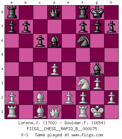Last move : 0-1 2008 January 3 10:21:21 [Event "FICGS__CHESS__RAPID_B__000075"] [Site "FICGS"] [Date "2007.11.13"] [Round "1"] [White "Lorena,Justine Rei"] [Black "Gouldar,Frances"] [Result "0-1"] [WhiteElo "1700"] [BlackElo "1654"] 1.Nc3 Nf6 2.g3 d5 3.Bg2 d4 4.Ne4 e5 5.d3 Nxe4 6.Bxe4 c6 7.Nf3 Bd6 8.O-O O-O 9.c3 dxc3 10.bxc3 Nd7 11.d4 exd4 12.cxd4 Nf6 13.Bc2 Bg4 0-1 This chess game has been lost on time (started : 2007.11.13 19:12:29) Dunst (Sleipner, Heinrichsen) Opening Kingside Castling by player White (move 8) Kingside Castling by player Black (move 8) Player Black won this chess game. Follow this game move after move (download)Tactics flow from a superior position. (Bobby Fischer) Ich kenne keine einzige Person, die behaupten würde, Garri Kasparow sei ein guter Mensch (Nigel Short) Un Peón pasado aumenta su poder a medida de que el número de piezas en el tablero disminuye. (Capablanca) Botvinnik disait en comparant les échecs à la musique: Il existe une science dont le but est l'étude de l'acoustique et des sons. Mais il y a aussi un art qui se sert de l'océan des sons : c'est la musique. De toute évidence, il en est de même pour la pensée. La logique est l'étude des lois de la réflexion et les échecs reflètent, en tant qu'art, le côté logique de la réflexion, sous la forme d'images artistiques... Extrait de Fischer - Spassky, Reykjavik 1972 par Alexander & F. Wyndham (Ed. Solar), p 37. A good aphorism is too hard for the tooth of time, and is not worn away with the centuries, although it serves as food for every speech. (Friedrich Nietzsche)