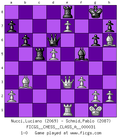 Last move : 1-0 2008 May 1 10:50:20 [Event "FICGS__CHESS__CLASS_A__000031"] [Site "FICGS"] [Date "2007.11.17"] [Round "1"] [White "Nucci,Luciano"] [Black "Schmid,Pablo"] [Result "1-0"] [WhiteElo "2069"] [BlackElo "2087"] 1.d4 Nf6 2.c4 g6 3.Nc3 d5 4.cxd5 Nxd5 5.e4 Nxc3 6.bxc3 c5 7.Bc4 Bg7 8.Ne2 O-O 9.O-O Nc6 10.Be3 Bg4 11.f3 Na5 12.Bd3 cxd4 13.cxd4 Be6 14.d5 Bxa1 15.Qxa1 f6 16.Bd2 Bd7 17.Qe1 b6 18.Nd4 Nb7 19.Bh6 Re8 20.Qe3 Nd6 21.e5 Nf5 22.Nxf5 Bxf5 23.Bc4 Rc8 24.Bb3 Rc5 25.Re1 Qd7 26.exf6 Qd6 27.fxe7 1-0 King's Indian defense, 3.Nc3 Kingside Castling by player Black (move 8) Kingside Castling by player White (move 9) Player White won this chess game. Follow this game move after move (download)By this measure (on the gap between Fischer & his contemporaries), I consider him the greatest world champion. (Garry Kasparov) Ohne Leiden bildet sich kein Charakter. (Ernst Freiherr von Feuchtersleben) Todavía soy una víctima del Ajedrez. Tiene toda la belleza del arte y mucho mas. No puede ser comercializado. El Ajedrez es mas puro que el arte en su posición social. (Marcel Duchamp) Je crois qu'il existe des manières très spécifiques de jouer efficacement contre une machine. Evidemment, nous n'avons aucune chance en technique pure, parce que l'ordinateur calcule de manière parfaite. Mais lorsque nous faisons appel à notre cerveau, en utilisant l'intuition et la compréhension, alors nous restons beaucoup plus forts. (Anatoli Karpov) Begin at the beginning and go on till you come to the end; then stop. (Lewis Carrol, Alice in Wonderland)