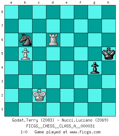 Last move : 1-0 2008 March 14 22:6:42 [Event "FICGS__CHESS__CLASS_A__000031"] [Site "FICGS"] [Date "2007.11.17"] [Round "1"] [White "Godat,Terry"] [Black "Nucci,Luciano"] [Result "1-0"] [WhiteElo "2083"] [BlackElo "2069"] 1.e4 e6 2.d4 d5 3.Nc3 Nf6 4.Bg5 Be7 5.e5 Nfd7 6.Bxe7 Qxe7 7.f4 a6 8.Nf3 b6 9.Qd2 c5 10.Nd1 Nc6 11.c3 Bb7 12.Ne3 O-O 13.Bd3 cxd4 14.cxd4 Qb4 15.f5 Qxd2+ 16.Kxd2 b5 17.a4 bxa4 18.Rxa4 Nb6 19.Ra3 Bc8 20.fxe6 fxe6 21.Rha1 Rb8 22.Bxa6 Bxa6 23.Rxa6 Rxf3 24.gxf3 Nxd4 25.Rf1 Nc6 26.b3 Nxe5 27.f4 Nc6 28.Nc2 Rb7 29.Rf3 Kf7 30.Re3 Ke7 31.Rh3 h6 32.Rg3 Kf6 33.Rc3 Nb8 34.Ra1 N6d7 35.h4 g6 36.Nd4 Rb4 37.Ra4 Rb6 38.Ke2 e5 39.fxe5+ Nxe5 40.Ra5 Rd6 41.R3c5 Nec6 42.Ra4 Nxd4+ 43.Rxd4 Ke5 44.Rd1 Nc6 45.Kd3 g5 46.Rdc1 Nb4+ 47.Kd2 Ke4 48.Rg1 Nc6 49.Rc3 Kf4 50.Re3 Nd4 51.Rf1+ Kg4 52.Rd3 Nc6 53.hxg5 hxg5 54.b4 Ne5 55.Rb3 d4 56.b5 Re6 57.Kc1 Rb6 58.Kc2 Kh4 59.Rf5 Nd7 60.Rb4 g4 61.Rxd4 Nf6 62.Rc5 Nh5 63.Rb4 Nf6 64.Rc6 Nd5 65.Rxb6 Nxb6 66.Rd4 Kh5 67.Rd6 1-0 French : Classical, Steinitz variation Kingside Castling by player Black (move 12) 10 pieces endgame at move 53 : White KRRPP , Black KRNPP WHITE : King + 2 Rooks 2 Pawns BLACK : King + 1 Rook 1 Knight 2 Pawns 9 pieces endgame at move 53 : White KRRP , Black KRNPP WHITE : King + 2 Rooks 1 Pawn BLACK : King + 1 Rook 1 Knight 2 Pawns 8 pieces endgame at move 61 : White KRRP , Black KRNP WHITE : King + 2 Rooks 1 Pawn BLACK : King + 1 Rook 1 Knight 1 Pawn 7 pieces endgame at move 65 : White KRRP , Black KNP WHITE : King + 2 Rooks 1 Pawn BLACK : King + 1 Knight 1 Pawn 6 pieces endgame at move 65 : White KRP , Black KNP WHITE : King + 1 Rook 1 Pawn BLACK : King + 1 Knight 1 Pawn Player White won this chess game. Follow this game move after move (download)Every Chess master was once a beginner. (Chernev) Ivan Sokolov treibt mich als Beifahrer an mit go Loeky go - . (Loek van Wely) El Rey es una pieza de pelea. ¡Usenlo!. (Wilhelm Steinitz) Soyez une menace à chaque fois que vous vous asseyez pour jouer. (Ken Smith) Chess is everything: art, science and sport. (Anatoly Karpov)