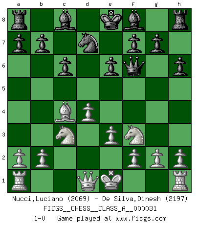 Last move : 1-0 2008 January 7 22:50:53 [Event "FICGS__CHESS__CLASS_A__000031"] [Site "FICGS"] [Date "2007.11.17"] [Round "1"] [White "Nucci,Luciano"] [Black "De Silva,Dinesh"] [Result "1-0"] [WhiteElo "2069"] [BlackElo "2197"] 1.d4 d5 2.c4 e6 3.Nf3 Nf6 4.Nc3 c6 5.Bg5 h6 6.Bxf6 Qxf6 7.e3 Nd7 8.Bd3 dxc4 9.Bxc4 1-0 This chess game has been lost on time (started : 2007.11.17 11:37:30) Queen's gambit declined Player White won this chess game. Follow this game move after move (download)Life is like a game of Chess, changing with each move. (Chinese proverb) Man braucht nicht immer den besten Zug zu spielen: Ein Zug muß aktiv, unternehmungslustig, korrekt und schön sein. (David Bronstein) Fischer no está bajo la obligación de nadie. (Joseph Platz) Les échecs sont un jeu terrible. Si vous n'avez pas le centre, votre adversaire a une position plus libre. Par contre, si vous avez le centre, alors vous avez vraiment quelque chose pour laquelle vous inquiéter ! (Siegbert Tarrasch) You think that education is too expensive ? Try ignorance. (Derek Bok)