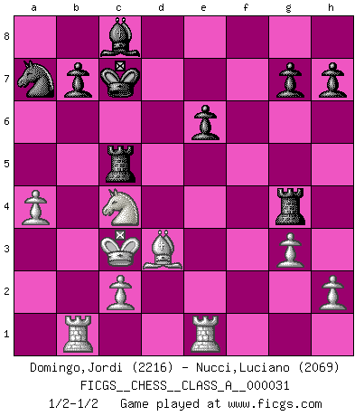 Last move : 1/2-1/2 2008 March 17 21:52:15 [Event "FICGS__CHESS__CLASS_A__000031"] [Site "FICGS"] [Date "2007.11.17"] [Round "1"] [White "Domingo,Jordi"] [Black "Nucci,Luciano"] [Result "1/2-1/2"] [WhiteElo "2216"] [BlackElo "2069"] 1.e4 e6 2.d4 d5 3.Nc3 Nf6 4.e5 Nfd7 5.f4 c5 6.Nf3 a6 7.Be3 Qb6 8.a3 Nc6 9.dxc5 Bxc5 10.Na4 Qa5+ 11.b4 Qxa4 12.bxc5 Qa5+ 13.Qd2 Qxd2+ 14.Kxd2 f6 15.exf6 Nxf6 16.Bd3 Bd7 17.Rab1 O-O-O 18.Rb2 Na5 19.Ne5 Rhf8 20.Bd4 Ng4 21.Nxg4 Rxf4 22.Bc3 Nc6 23.Ne5 d4 24.Bxd4 Nxd4 25.Re1 Kc7 26.Rb4 a5 27.Rb6 Nc6 28.Nc4 Bc8 29.Kc3 Rd5 30.Rb5 Na7 31.Rxa5 Nc6 32.Rb5 Na7 33.R5b1 Rxc5 34.a4 Rg4 35.g3 1/2-1/2 French : Steinitz variation Queenside Castling by player Black (move 17) This chess game ended in a draw. Follow this game move after move (download)There just isn't enough televised Chess. (David Letterman) Über Karpov: Er war und ist ein Vertreter der russischen Reaktionäre. Das steckt tief in seiner Seele, wehalb ich nicht nett mit ihm umgehen kann. (Viktor Kortschnoi) Hoy en día, si tu no eres un Gran Maestro a los 14 años, es mejor que lo olvides. (Anand Viswanathan) Horreur, mais aussi harmonie suprême : qu'y avait-il en effet au monde en dehors des échecs ? Le brouillard, l'inconnu, le non-être... (Vladimir Nabokov) You can't play chess if you're groggy from pills. (Anatoly Karpov)