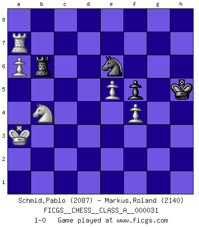 Last move : 1-0 2008 May 15 14:49:57 [Event "FICGS__CHESS__CLASS_A__000031"] [Site "FICGS"] [Date "2007.11.17"] [Round "1"] [White "Schmid,Pablo"] [Black "Markus,Roland"] [Result "1-0"] [WhiteElo "2087"] [BlackElo "2140"] 1.d4 Nf6 2.f3 e6 3.e4 d5 4.e5 Nfd7 5.c3 c5 6.a3 Nc6 7.f4 Be7 8.Nf3 O-O 9.Bd3 Qb6 10.h4 f6 11.Bxh7+ Kxh7 12.Ng5+ Kh6 13.Nxe6 f5 14.g4 cxd4 15.cxd4 Ndb8 16.g5+ Kg6 17.h5+ Kf7 18.Nxf8 Bxf8 19.h6 Kg8 20.Qh5 Qd8 21.Be3 Be6 22.hxg7 Bxg7 23.Qg6 Qd7 24.Rh6 Nd8 25.Nc3 Kf8 26.Qh5 Bxh6 27.gxh6 Qf7 28.Qh1 Qh7 29.Kd2 Nf7 30.Rg1 Qxh6 31.Qxh6+ Nxh6 32.Rg6 Ng4 33.Rxe6 Nc6 34.Rd6 Na5 35.b3 Rc8 36.Nxd5 Nxb3+ 37.Kd3 Rc6 38.Rd7 Nxe3 39.Nxe3 Nc1+ 40.Kd2 Nb3+ 41.Ke1 Ke8 42.Rxb7 Nxd4 43.Rxa7 Rb6 44.Kd2 Rb3 45.Nd5 Kf8 46.Ra8+ Kf7 47.a4 Ne6 48.Ra6 Rb2+ 49.Kc3 Rb1 50.a5 Rc1+ 51.Kb4 Rb1+ 52.Ka3 Ra1+ 53.Kb2 Ra4 54.Ra7+ Kg6 55.a6 Ra5 56.Ne7+ Kh5 57.Nc6 Rb5+ 58.Ka3 Rb6 59.Nb4 1-0 Comment by player 1 : Pablo Schmid : I still wonder if my opponent expected my 11.Bxh7! as a good move before I played that. Despite the fact that he defended very well after that, I found ressources to continue the attack and convert it into a gain of 2 pawns in what should be a winning but still not so easy ending to play. Paleface attack Kingside Castling by player Black (move 8) 10 pieces endgame at move 43 : White KRNPPP , Black KRNP WHITE : King + 1 Rook 1 Knight 3 Pawns BLACK : King + 1 Rook 1 Knight 1 Pawn Player White won this chess game. Follow this game move after move (download)A good sacrifice is one that is not necessarily sound but leaves your opponent dazed and confused. (Rudolph Spielmann) Ihnen, Herr Lasker, habe ich nur drei Worte zu sagen: Schach und matt. (Siegbert Tarrasch) El Ajedrez es un regaderazo frío para la mente. (Sir John Simon) Tous ces prétendus hommes politiques sont les pions, les Cavaliers, les Tours ou les Fous d'une partie d'échecs qui se jouera tant qu'un hasard ne renversera pas l'échiquier. (Honoré de Balzac) Before all elsed, be armed. (Niccolo Machiavelli)