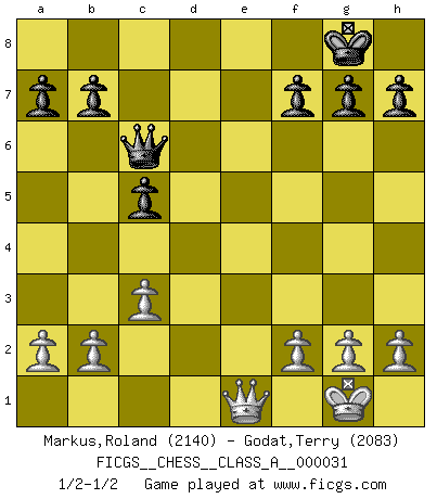 Last move : 1/2-1/2 2007 December 8 15:52:44 [Event "FICGS__CHESS__CLASS_A__000031"] [Site "FICGS"] [Date "2007.11.17"] [Round "1"] [White "Markus,Roland"] [Black "Godat,Terry"] [Result "1/2-1/2"] [WhiteElo "2140"] [BlackElo "2083"] 1.e4 e5 2.Nf3 Nc6 3.d4 exd4 4.Nxd4 Bc5 5.Be3 Qf6 6.c3 Nge7 7.Bc4 Ne5 8.Be2 Qg6 9.O-O d6 10.Kh1 Qxe4 11.Nd2 Qg6 12.Nb5 O-O 13.Nxc7 Rb8 14.Nc4 Bh3 15.Rg1 Nxc4 16.Bxc5 dxc5 17.Bxc4 Qb6 18.Nd5 Nxd5 19.Bxd5 Be6 20.Bxe6 Qxe6 21.Re1 Qc6 22.Kg1 Rbd8 23.Qe2 Rfe8 24.Rad1 Rxd1 25.Qxd1 Rxe1+ 26.Qxe1 1/2-1/2 Scotch game Kingside Castling by player White (move 9) Kingside Castling by player Black (move 12) This chess game ended in a draw. Follow this game move after move (download)Let the perfectionist play postal. (Yasser Seirawan) Wenn Capablanka heute auf der Schachbühne erscheinen würde, hätte er ein halbes Jahr gebraucht um sich die Schachtheorie anzueignen. Und dann hätte er alles und jeden besiegt. (Mikhail Moiseyevich Botvinik) No puedes jugar al Ajedrez si eres de corazón noble. (Proverbio Francés) Aidez vos pièces, elles vous aideront. (Paul Morphy) Is not life a hundred times too short to bore ourselves ? (Friedrich Nietzsche)