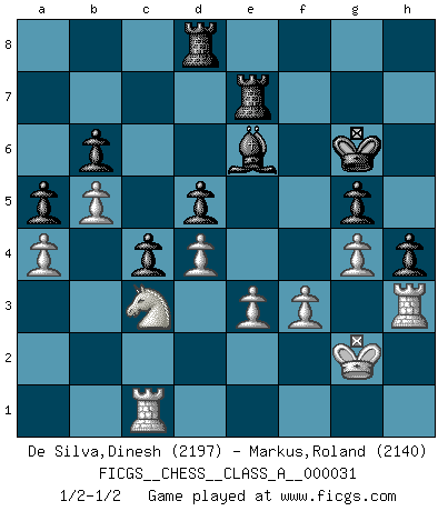 Last move : 1/2-1/2 2008 December 17 21:4:19 [Event "FICGS__CHESS__CLASS_A__000031"] [Site "FICGS"] [Date "2007.11.17"] [Round "1"] [White "De Silva,Dinesh"] [Black "Markus,Roland"] [Result "1/2-1/2"] [WhiteElo "2197"] [BlackElo "2140"] 1.d4 Nf6 2.c4 e6 3.Nc3 Bb4 4.e3 O-O 5.Bd3 d5 6.Nf3 b6 7.O-O Bb7 8.cxd5 exd5 9.a3 Bd6 10.b4 Nbd7 11.Qb3 Re8 12.a4 c6 13.Ba3 a5 14.b5 c5 15.Bf5 Rc8 16.Rad1 g6 17.Bh3 Rc7 18.Qb2 Qe7 19.Qa1 c4 20.Bxd6 Qxd6 21.Bxd7 Qxd7 22.Rc1 Qd6 23.Ne5 Nh5 24.Rfe1 f6 25.Nf3 Ng7 26.Qb2 Nf5 27.Qc2 Qa3 28.Ra1 Qe7 29.Qd1 Kg7 30.Rc1 Qb4 31.Qc2 Qb3 32.Rf1 Nd6 33.Nd2 Qxc2 34.Rxc2 g5 35.Re1 h5 36.Kf1 Nf5 37.R2c1 Kg6 38.Ne2 Nd6 39.h4 Ne4 40.Nxe4 Rxe4 41.hxg5 fxg5 42.Nc3 Re8 43.Ke2 h4 44.Rh1 Rf7 45.Rh2 R8e7 46.Rf1 Rf8 47.Re1 R7e8 48.Rf1 Rd8 49.Rg1 Bc8 50.g4 Be6 51.Rh3 Rde8 52.Rf3 Rh8 53.Rh3 Rh7 54.f3 Rf7 55.Ke1 Rfe7 56.Kf2 Rd8 57.Re1 Rf7 58.Ke2 Rdf8 59.Rg1 Re7 60.Kf2 Kg7 61.Ke2 Bg8 62.Re1 Kg6 63.Kf2 Rh7 64.Rc1 Rd7 65.Re1 Be6 66.Kg2 Rf6 67.Rd1 Rd8 68.Rc1 Rf7 69.Rd1 Re7 70.Rc1 1/2-1/2 Nimzo-Indian : 4.e3 O-O, 5.Bd3 d5 Kingside Castling by player Black (move 4) Kingside Castling by player White (move 7) This chess game ended in a draw. Follow this game move after move (download)The blunders are all there on the board, waiting to be made. (Savielly Tartakover) Kombinieren und Schwarzhandel gehören verboten. (Savielly Grigorievitsch Tartakower) Cada Peón es potencialmente una Reina. (James Mason) Tout change constamment, y compris dans le monde des Echecs. (Botvinnik) There is no instance of a country having benefited from prolonged warfare. (Sun Tzu)